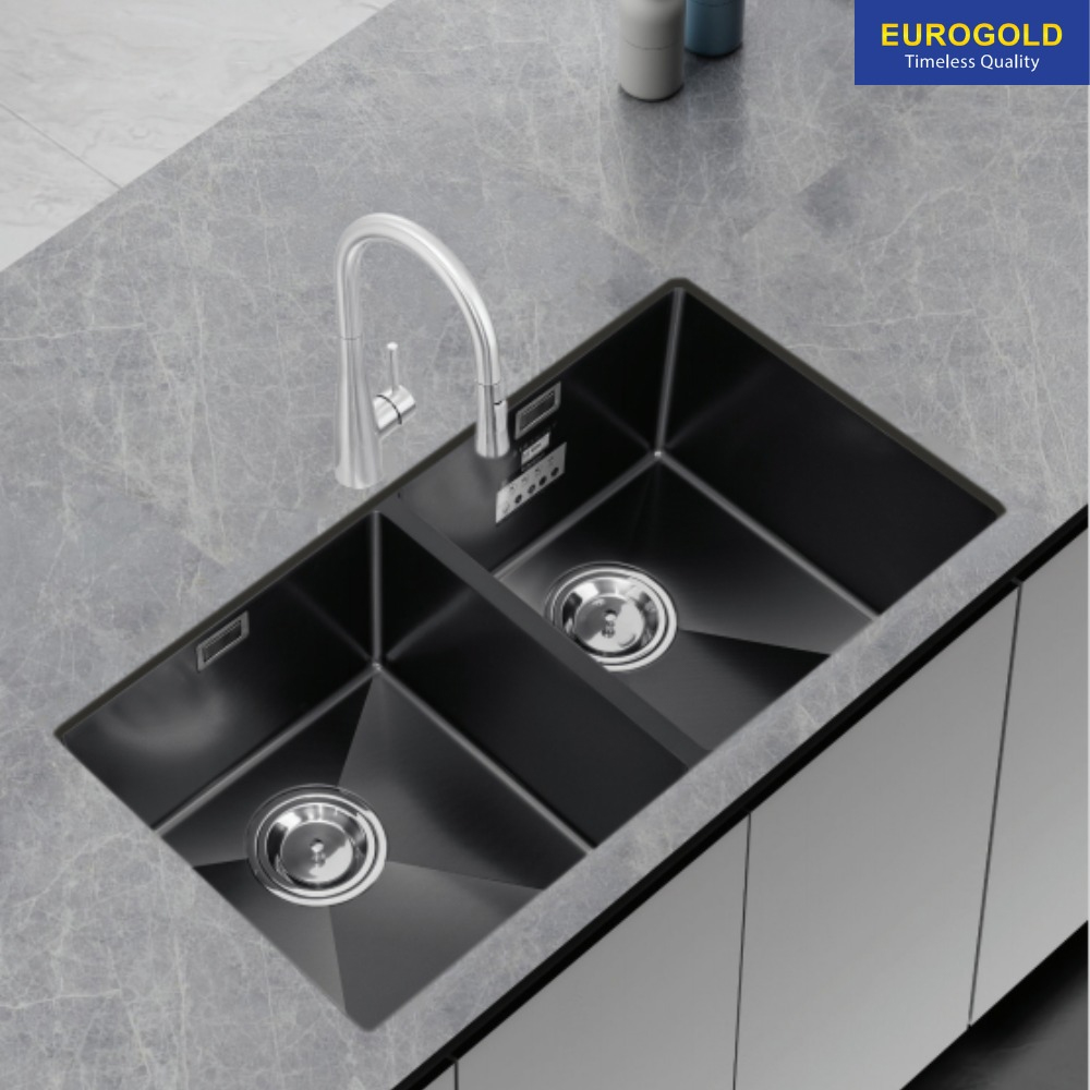 Chậu rửa 2 hố cân lắp âm chống xước màu đen Inox 304 Eurogold EUC28746ED