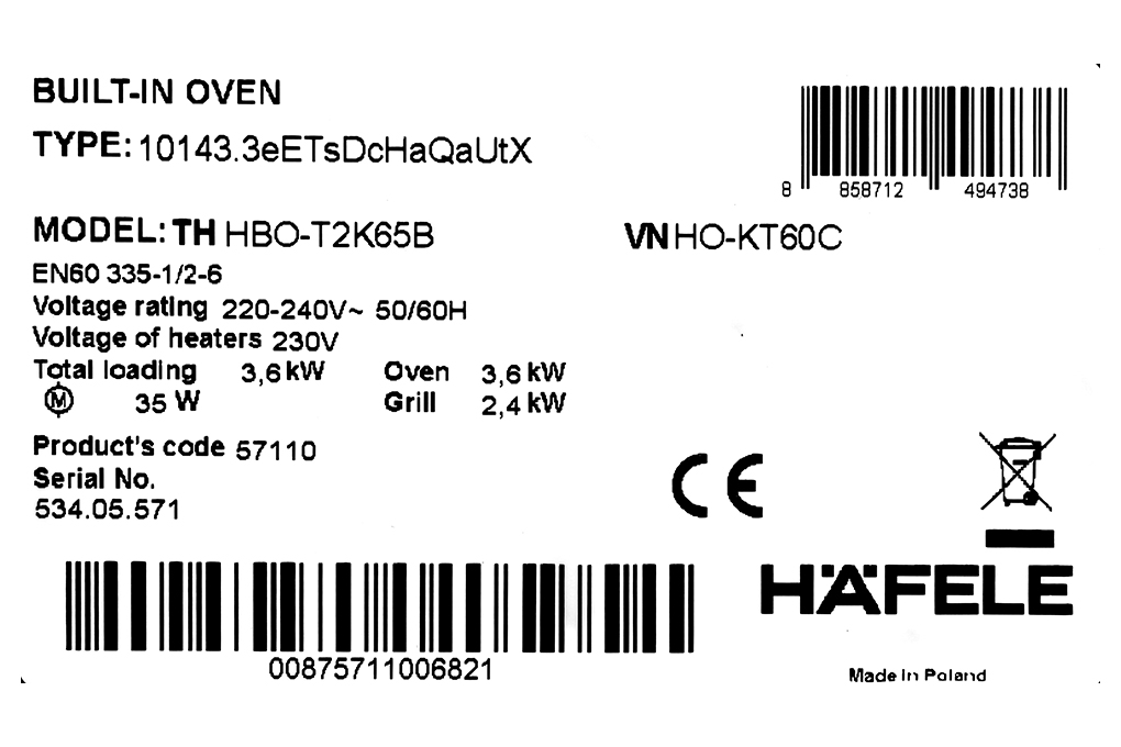 Lò nướng âm tủ 65 lít Series 500 Hafele HO-KT60C | 534.05.571