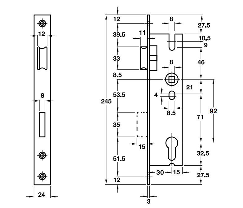Thân khóa lưỡi gà chốt chết cho cửa đố nhỏ Inox 304 mờ Backset 30mm & C/C 92mm Hafele 911.77.260