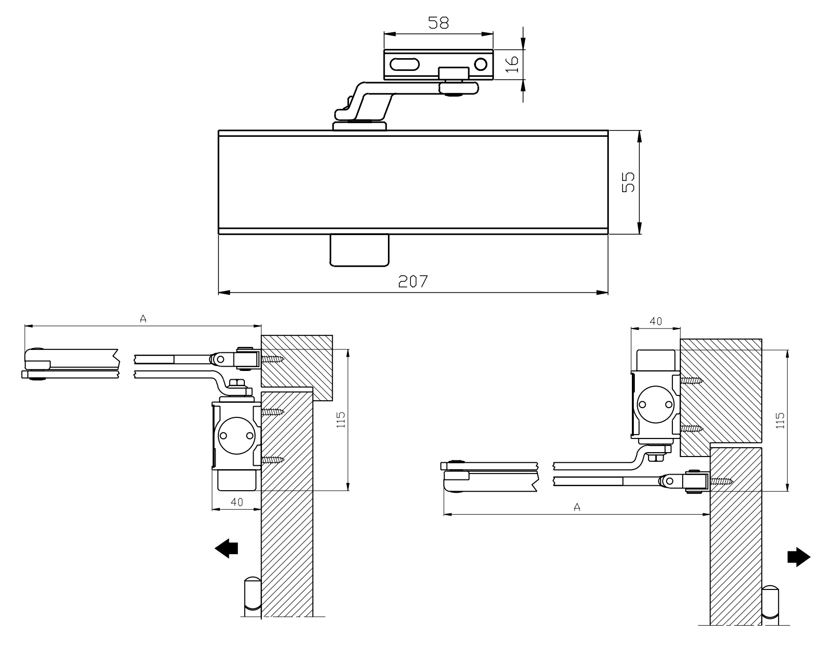 Thiết bị đóng cửa tự động lắp nổi DCL 15 80kg không có chức năng giữ cửa màu đen Hafele 931.84.623
