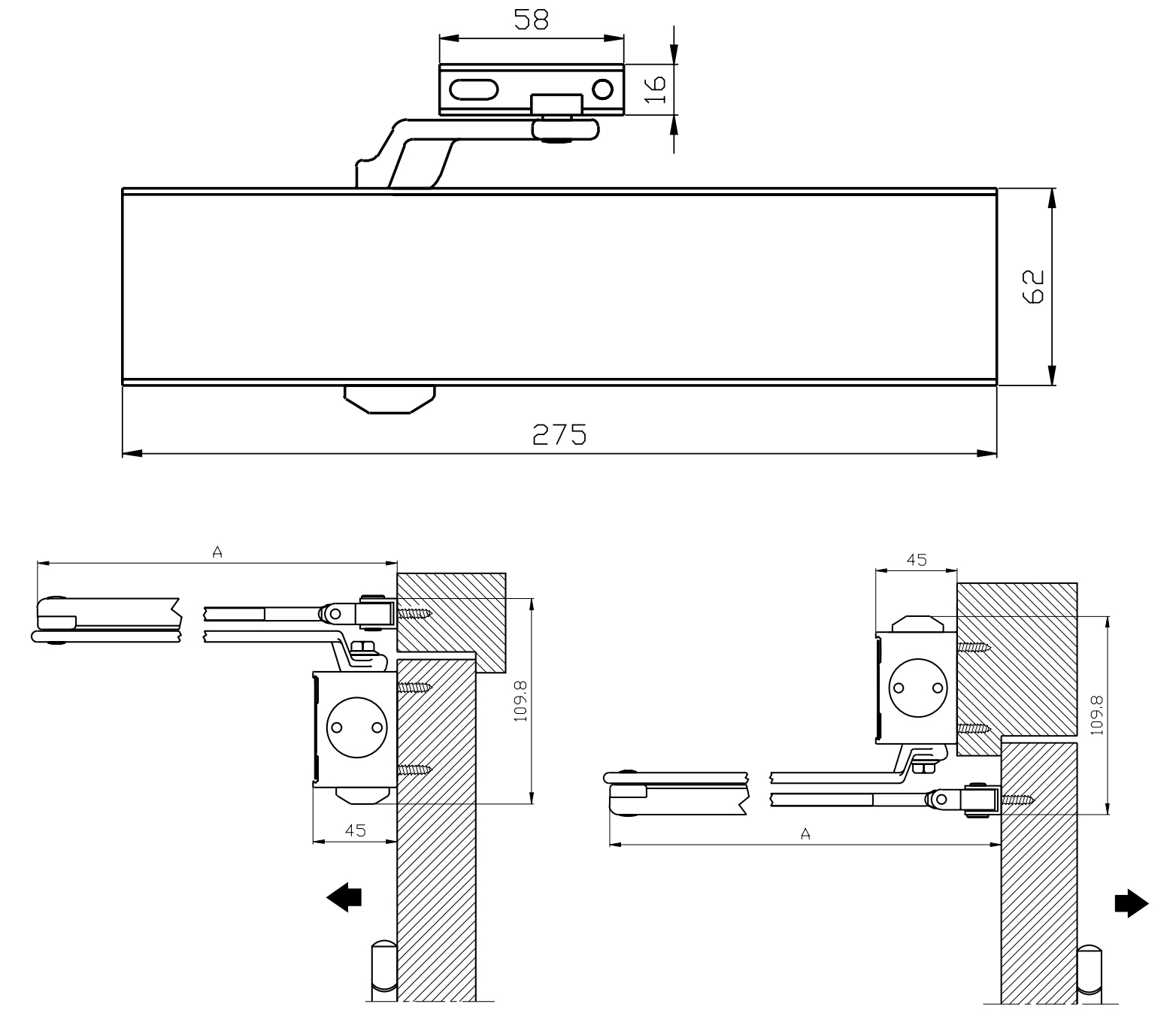 Thiết bị đóng cửa tự động lắp nổi DCL55 150kg có chức năng giữ cửa màu bạc Hafele 931.84.819