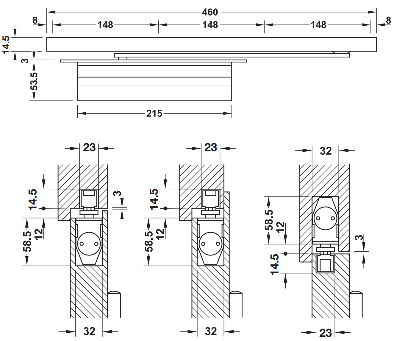 Thiết bị đóng cửa tự động lắp âm DLC34 EN4 80kg không có chức năng giữ cửa màu bạc Hafele 931.84.059
