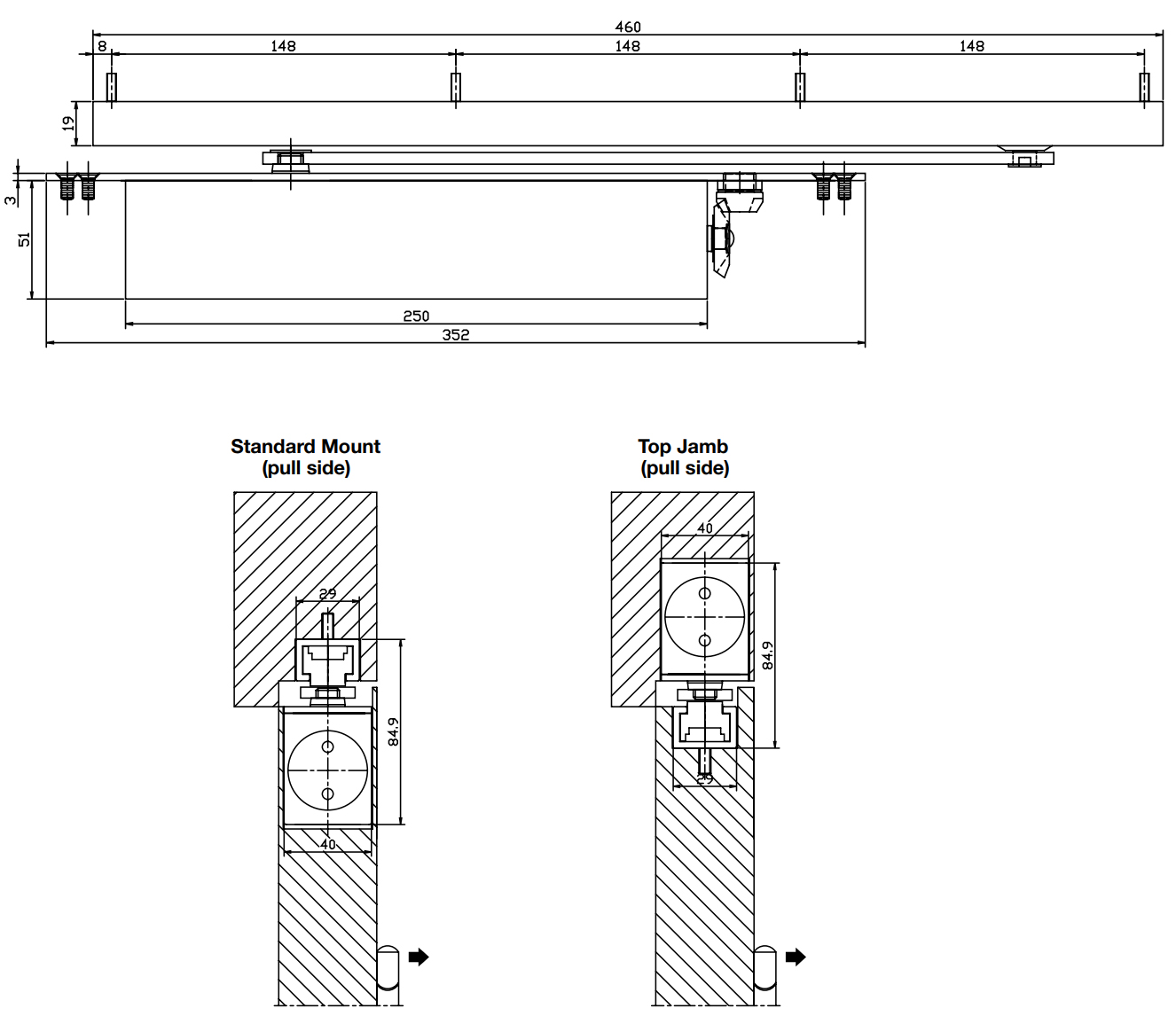 Thiết bị đóng cửa tự động lắp âm DCL70 150kg có chức năng giữ cửa màu bạc Hafele 931.84.389