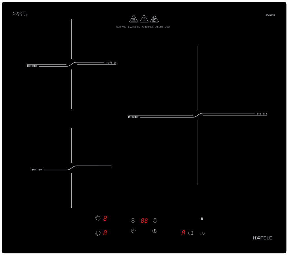 Bảng mạch điều khiển của sản phẩm tôi đang giới thiệu với bạn hôm nay sử dụng loại bảng điều khiển Controls Touch với đặc trưng điều khiển rời cả 2 vùng nấu với thao tác tăng giảm duy nhất là chạm. Với lại bảng mạch này có khả năng chịu được đến 105 độ C và chỉ tiêu thụ có chưa đầy 0,5W/h rất tiết kiệm điện. Đồng thời nó cũng được lập trình nhiều tính năng nấu thông minh như: hâm nóng, tạm dừng… tương lai Hafele có thể sẽ có những bản nâng cấp khác.