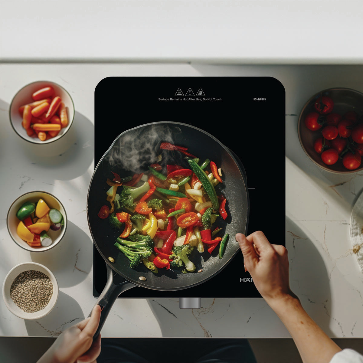 Nấu thức ăn với độ chính xác cao, phản ứng tức thì với mức nhiệt mong muốn: Chính mạch công suất hiện đại giúp bếp từ Hafele HS-I281FG | 536.61.991 có khả năng phản ứng thay đổi công suất theo điều khiển rất nhanh, khi người dùng điều chỉnh tăng giảm nhiệt độ đun nấu, bếp điều chỉnh thay đổi tức thì về mức nhiệt độ mong muốn.