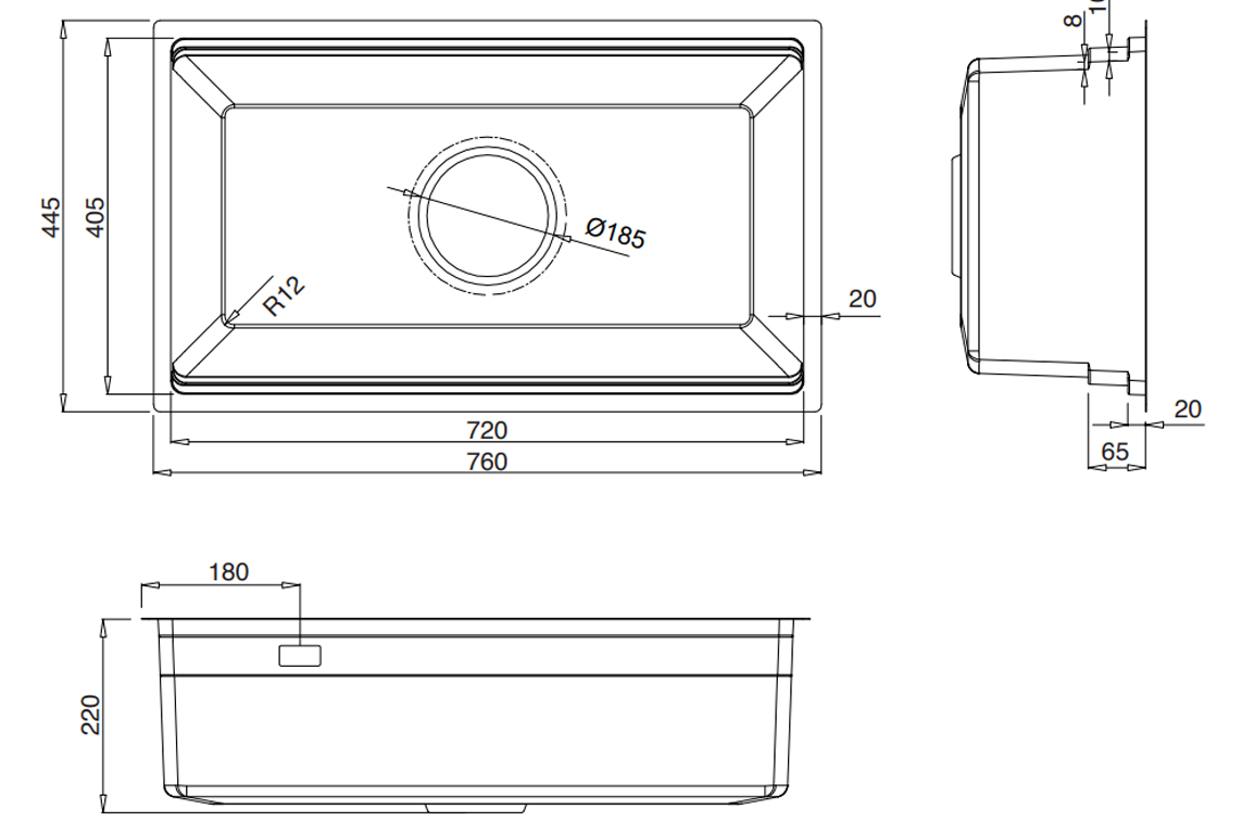 - Kích thước chậu: R760 x S445 x C220 (mm).