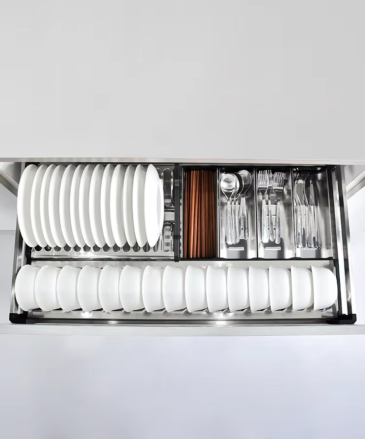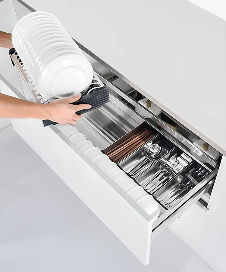 Giá bát đĩa đa năng Inox hộp cánh kéo 900mm Eurogold EU132900 | EUB6590 có thiết kế đa năng tích hợp 3 trong 1, ngoài để bát đĩa, giá còn để dao thìa, dĩa...