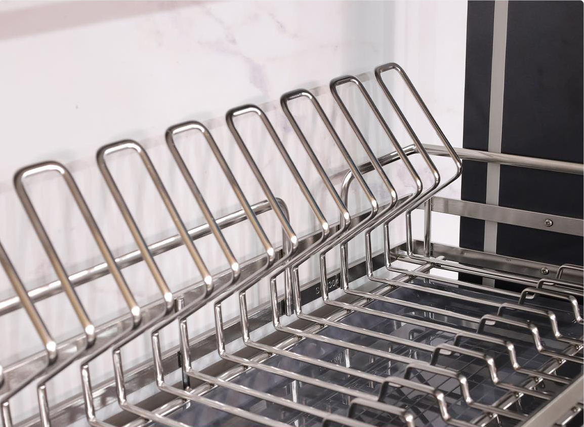 Bộ khung được sản xuất từ chất liệu thép Carbon sơn nhiệt màu ghi đậm cao cấp, kết hợp bộ rổ úp bát đĩa làm từ chất liệu INOX SUS304 dạng nan Oval cao cấp.