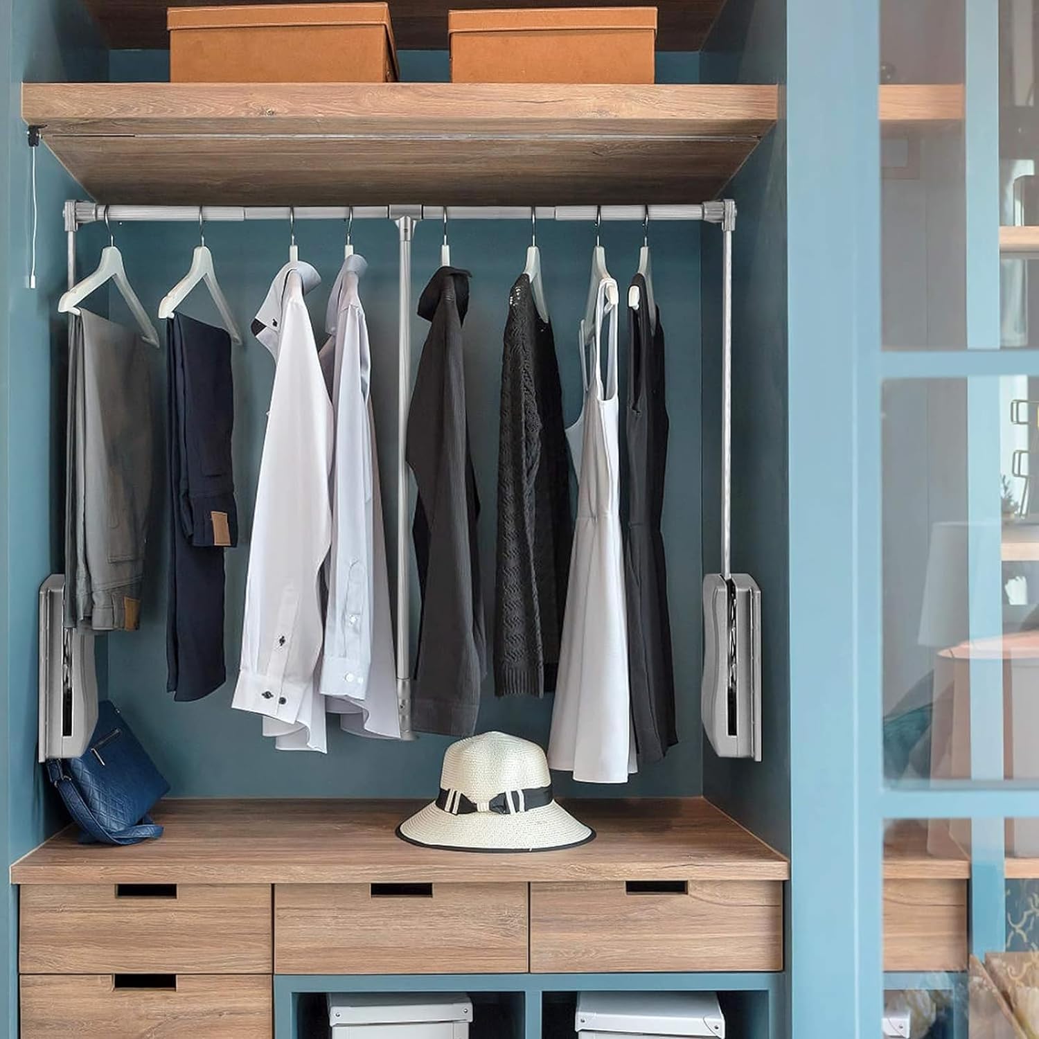 Không chỉ riêng đối với những chiếc tủ có chiều cao chạm tới trần nhà mà cả những chiếc tủ có khoảng không phía trên rộng và chưa được tận dụng hết đều nên bố trí lắp đặt thêm giá mắc di động để tận dụng tối đa không gian tủ đồng thời tăng diện tích lưu trữ quần áo lên một cách đáng kể.