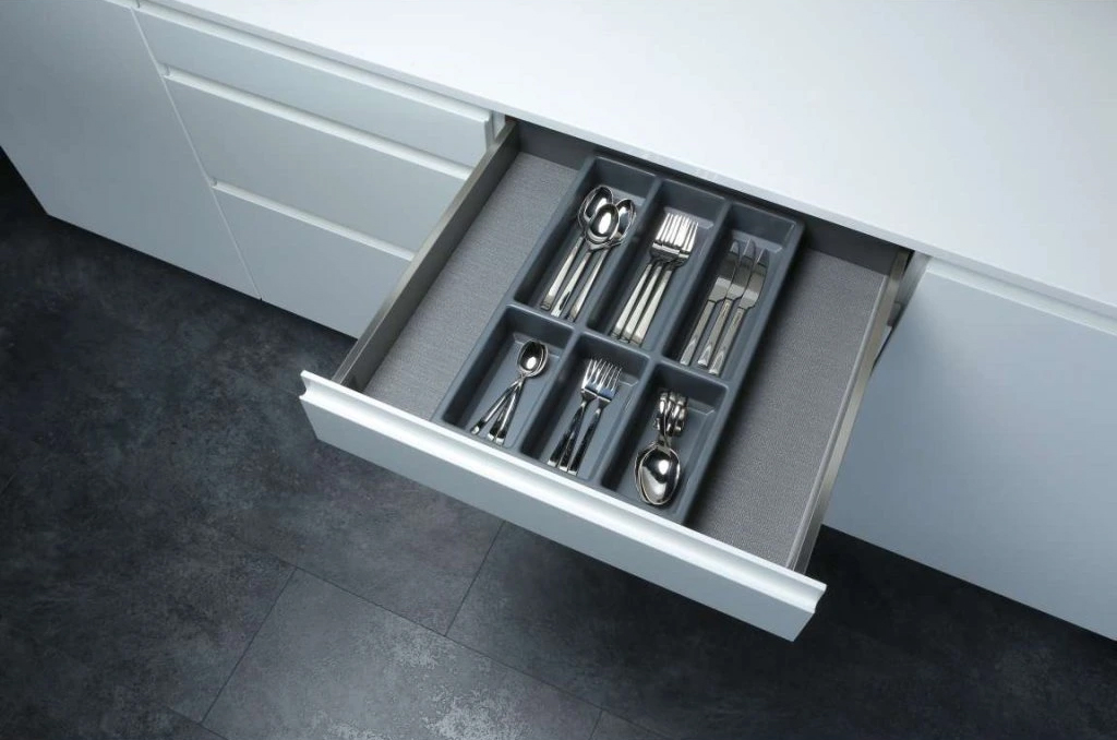 Khay chia đa năng đựng dao kéo thìa nĩa nhựa màu xám cho ngăn kéo rộng 300mm Classico Separado Hafele 556.70.040