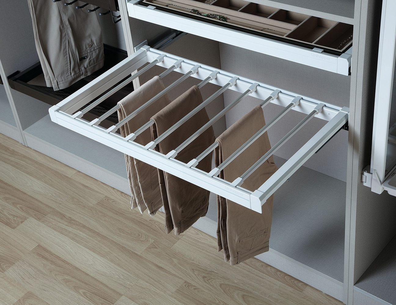 Thiết kế thể hiện phong cách tối giản và sang trọng nhẹ nhàng, tăng cường khả năng lưu trữ trong tủ áo. Các thanh treo chống trượt có thể tháo rời, điều chỉnh linh hoạt giúp dễ dàng treo và lấy quần.