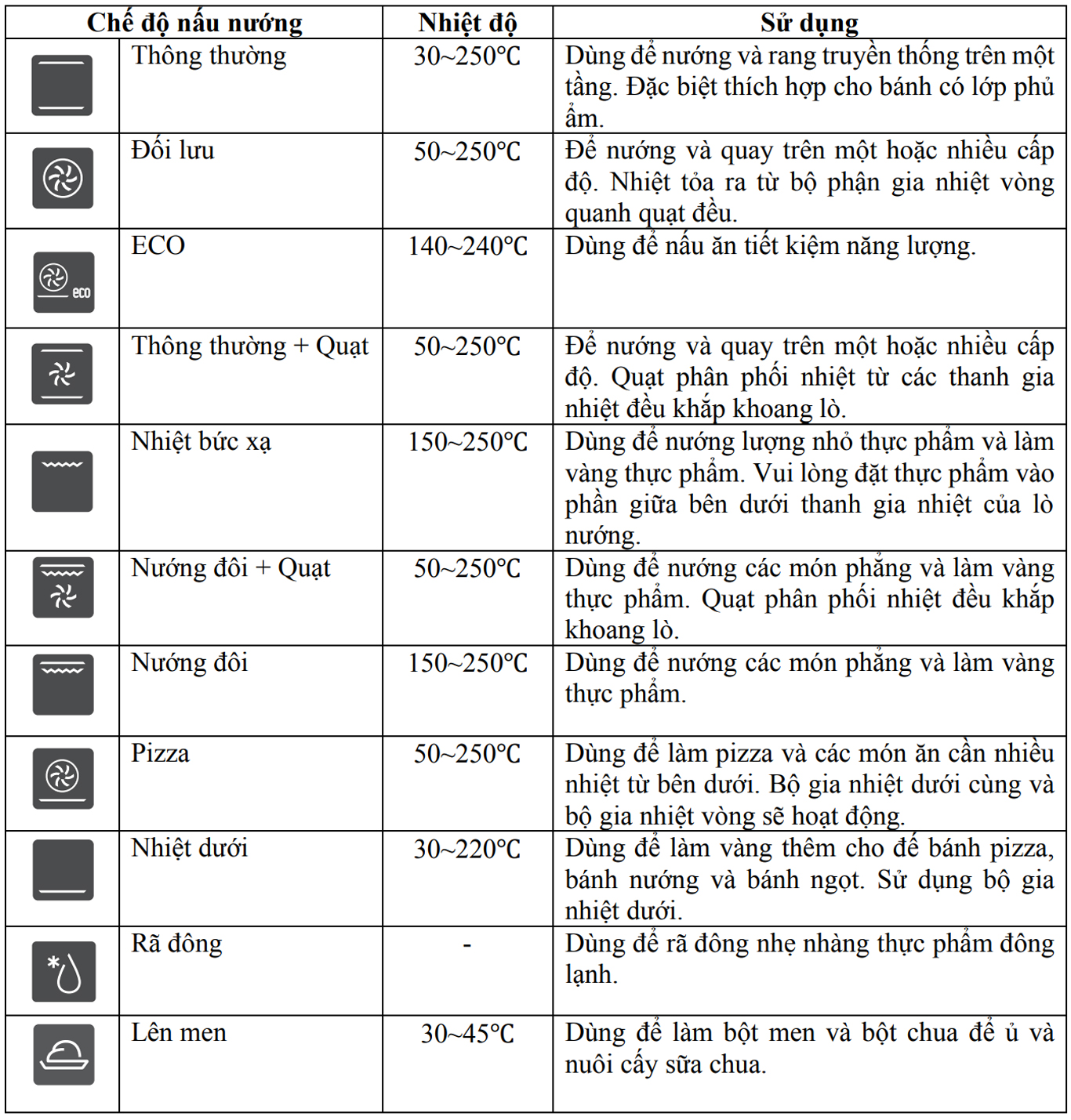- 11 chương trình nướng: Thông thường, Đối lưu, Tiết kiệm, Thông thường + quạt, Nhiệt bức xạ, Nướng đôi + quạt, Nướng đôi, Pizza, Làm nóng từ dưới, Rã đông, Lên men
