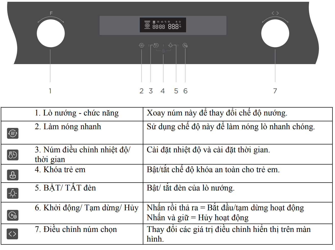1. Sử dụng núm chọn chức năng lò để thay đổi chế độ làm nóng