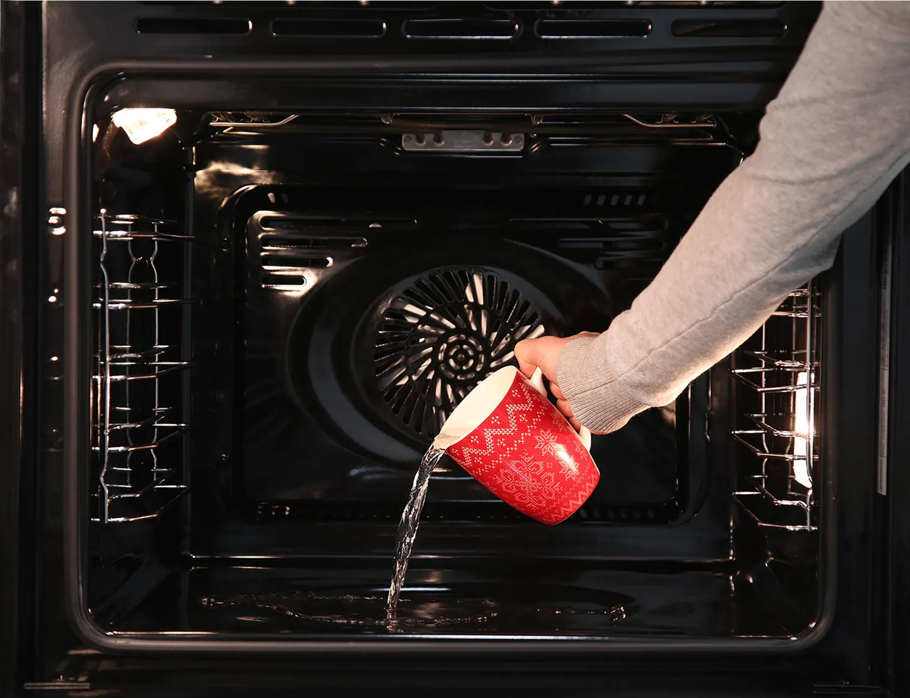 Bạn có thể dễ dàng, đơn giản chỉ cần khoảng 400ml nước pha trộn chất tẩy rửa vào đáy lò hoặc khay nướng. Sau đó, hãy sử dụng chế độ "làm nóng từ đáy" với nhiệt độ 80°C-100°C trong thời gian 4-6 phút.