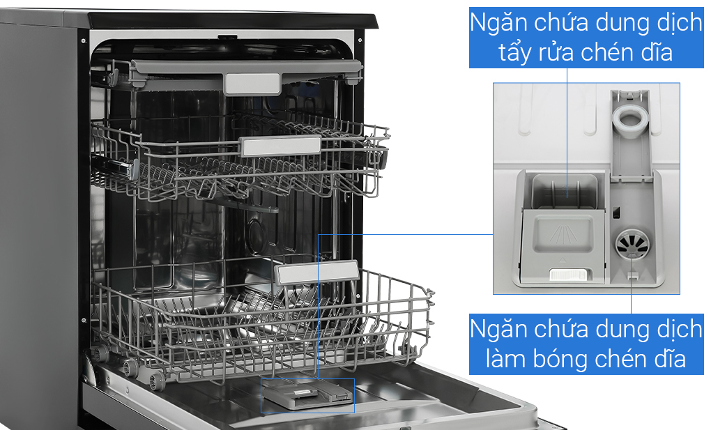 Bên cạnh đó, phần cánh cửa đóng mở có ngăn đựng chất làm bóng và ngăn đựng viên tẩy rửa. Chất làm bóng giúp cho bát đĩa được sáng và bóng hơn, trong khi đó viên tẩy rửa là chất liệu quan trọng để đánh sạch mọi vết bẩn.