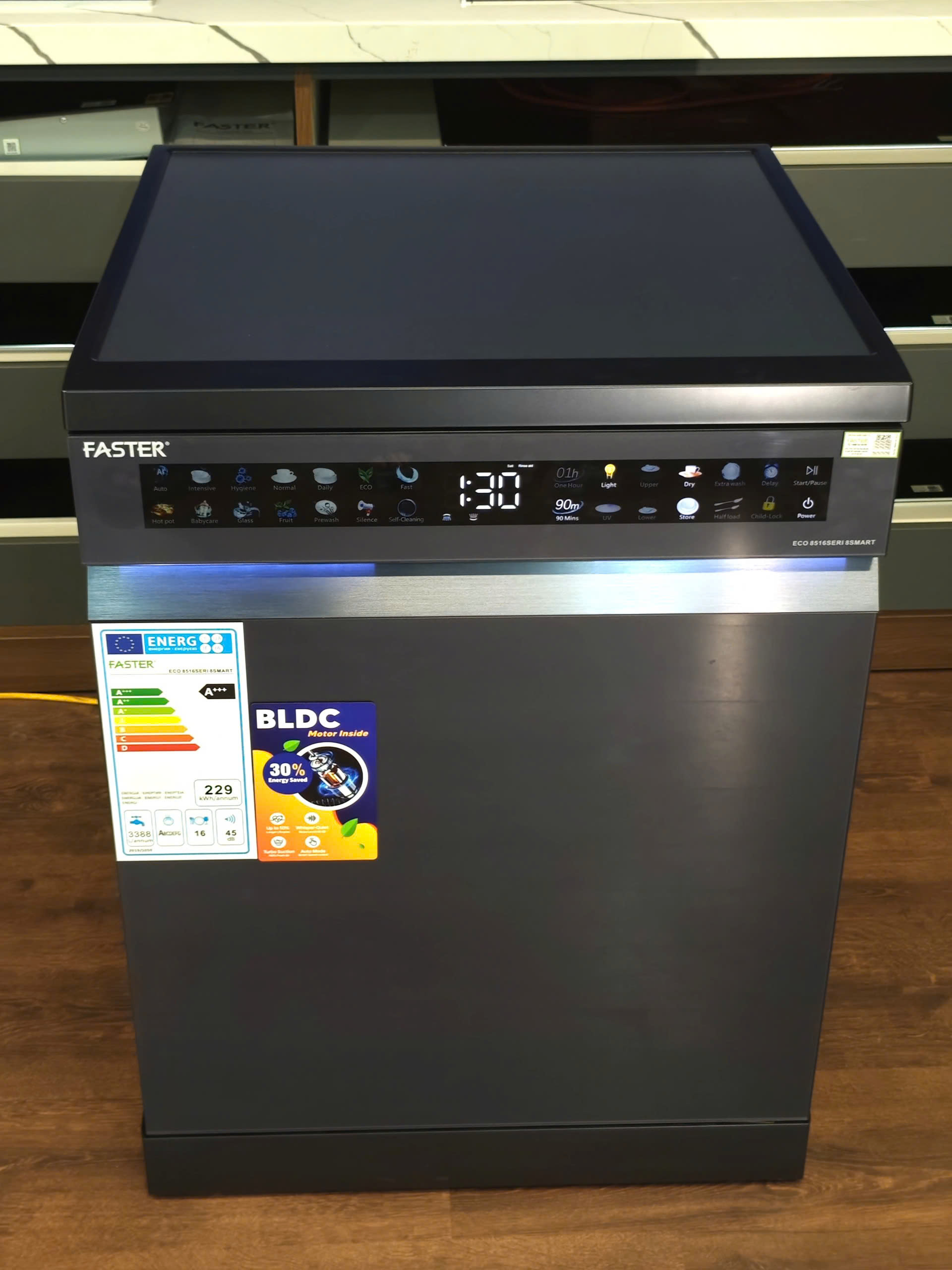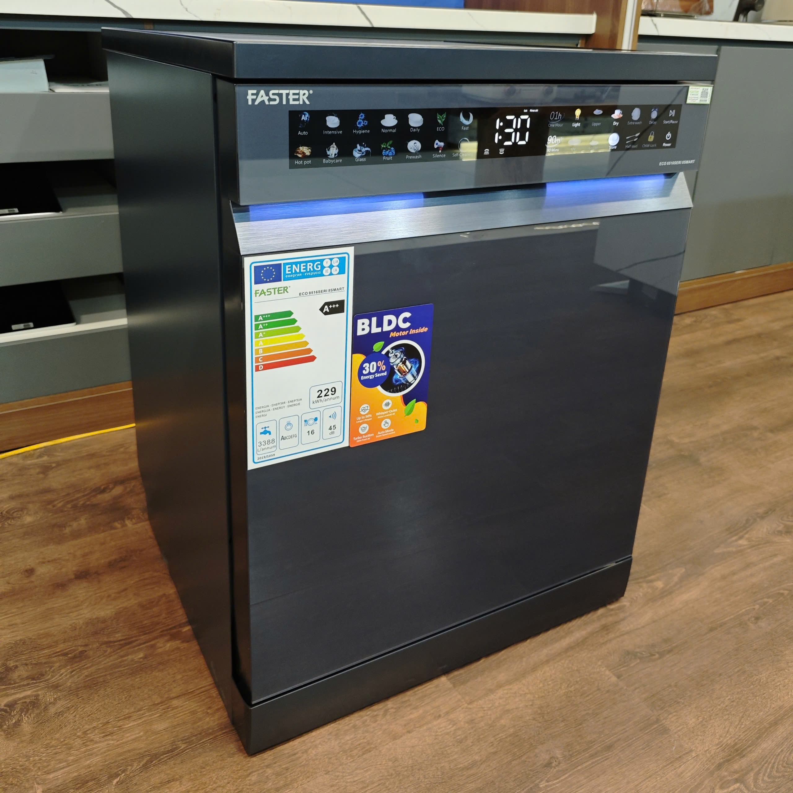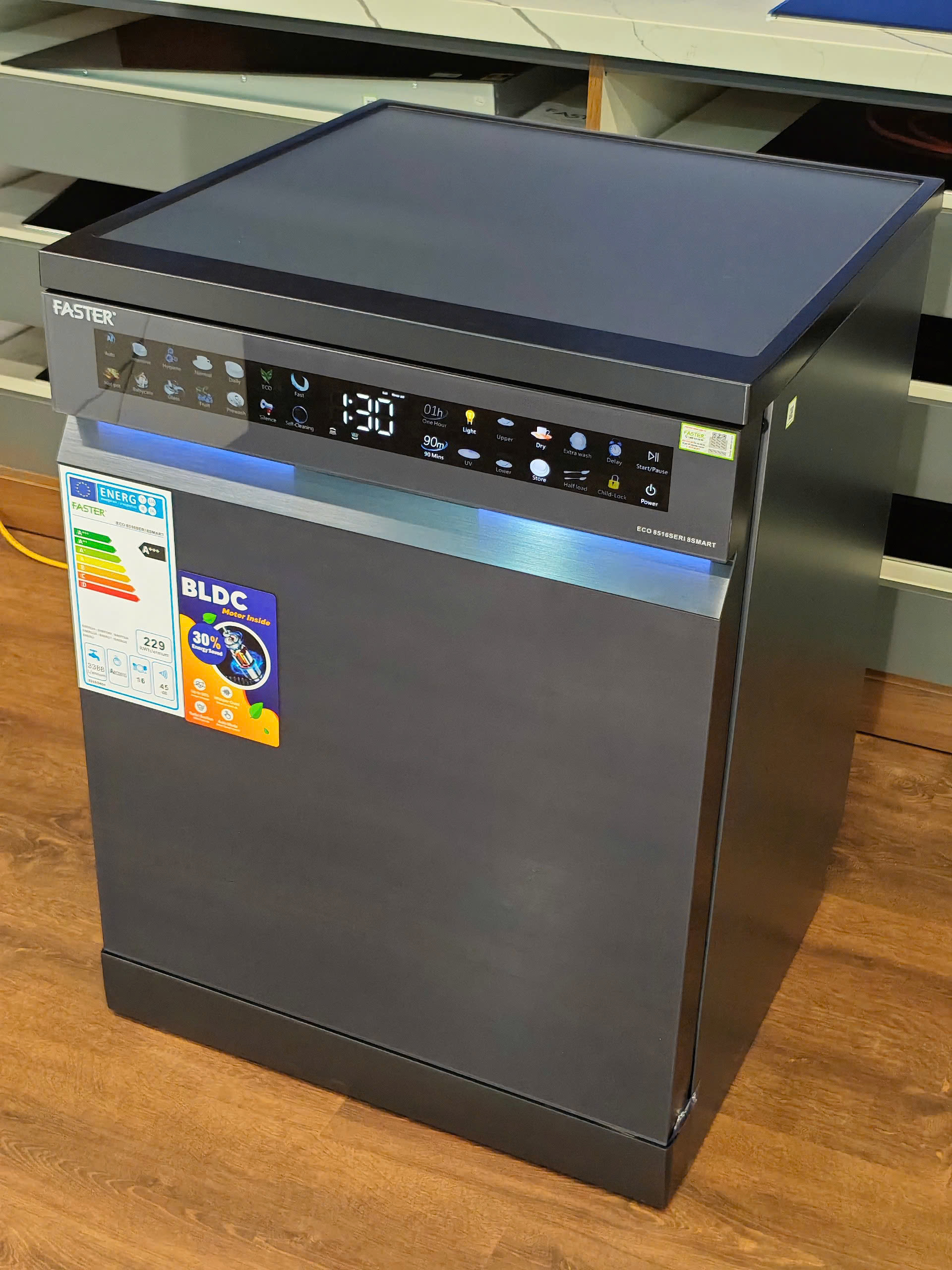 Máy rửa bát độc lập thông minh AI | Faster ECO 8516 SERI 8 SMART | cửa kính chống bám vân tay | màu xám xanh | 16-18 bộ | nhập khẩu nguyên chiếc từ Malaysia | sấy khô triệt để | diệt khuẩn tối ưu | lưu trữ hoàn hảo | dễ dàng vệ sinh | cùng hsn.vn tìm hiểu kỹ hơn về sản phẩm này