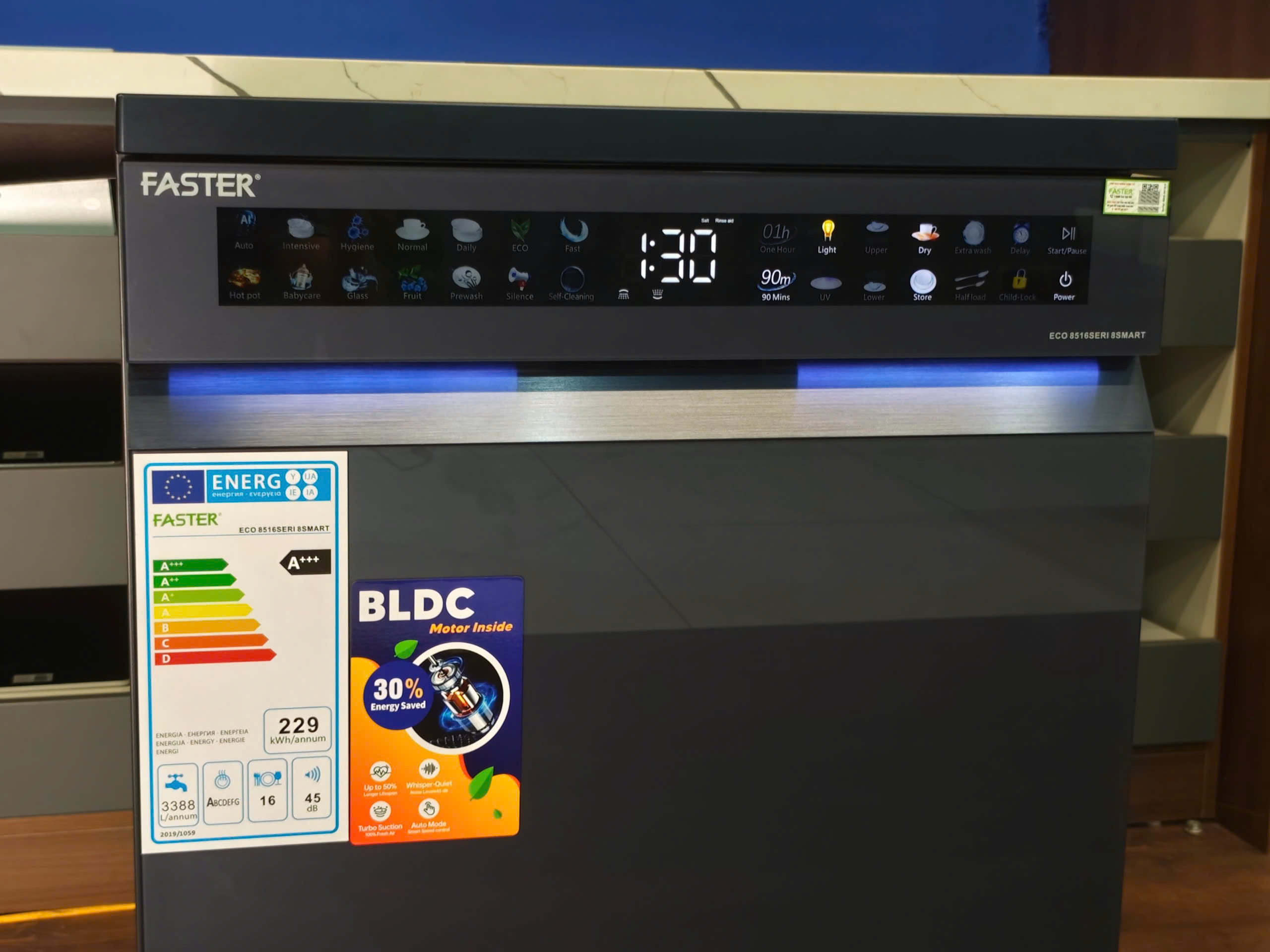 Máy rửa bát Faster ECO 8516 SERI 8 SMART có công suất tiêu thụ 1750W, lượng nước tiêu thụ khoảng 12.2 lít/1 lần rửa, cho phép rửa 16-18 bộ bát đĩa Châu Âu tương đương với 1-2 bữa ăn Việt (gia đình 4-6 thành viên). Máy trang bị 16 chương trình rửa được tùy chỉnh dễ dàng trên bảng điều khiển điện tử kết hợp màn hình LED.