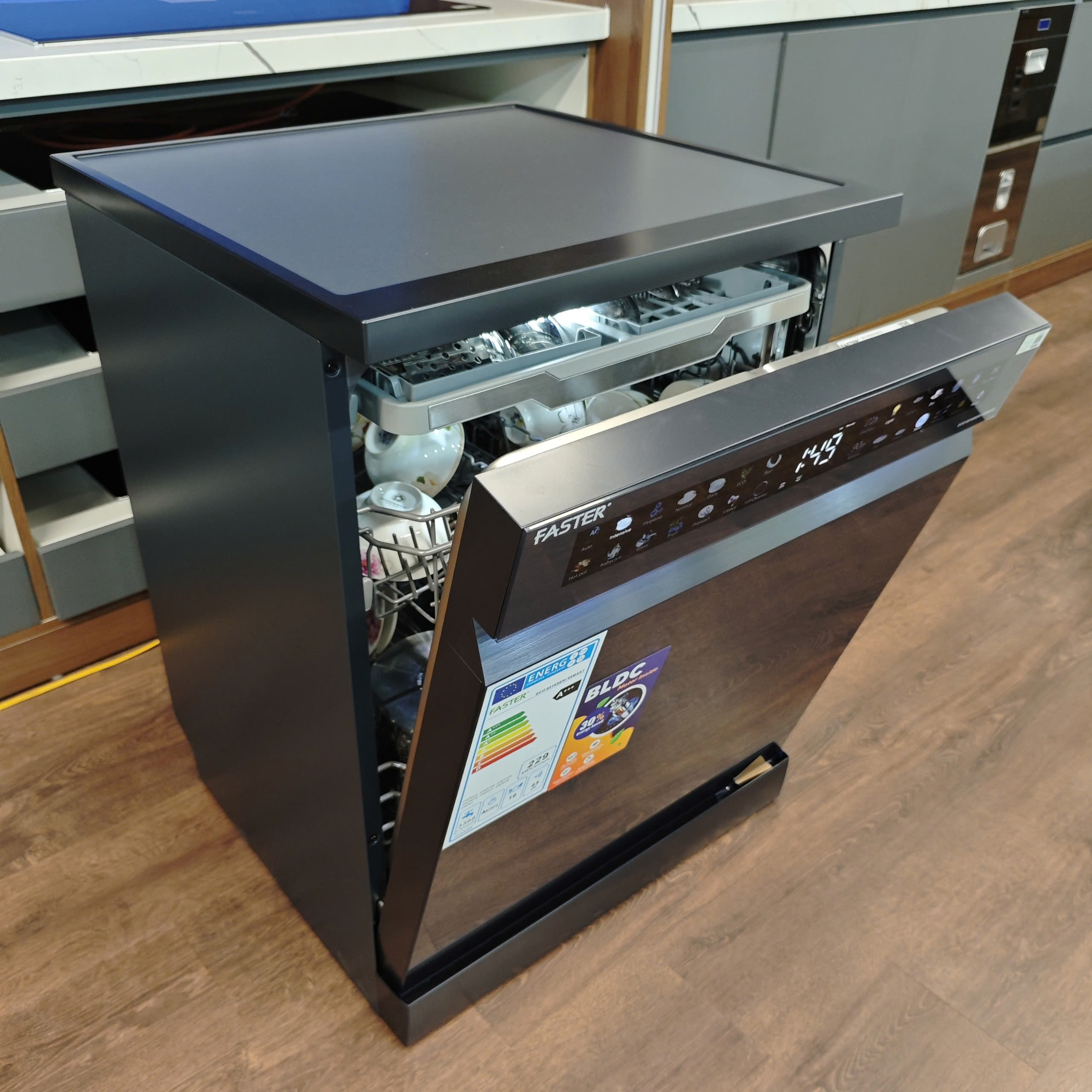Tăng tính thẩm mỹ cho gian bếp gia đình: Thiết kế sang trọng, hiện đại máy rửa bát 16-18 bộ Faster ECO 8516 SERI 8 SMART dễ dàng chinh phục được mọi không gian bếp. Màu xám xanh, tinh tế tới từng chi tiết, không khó để tạo điểm nhấn nổi bật.
