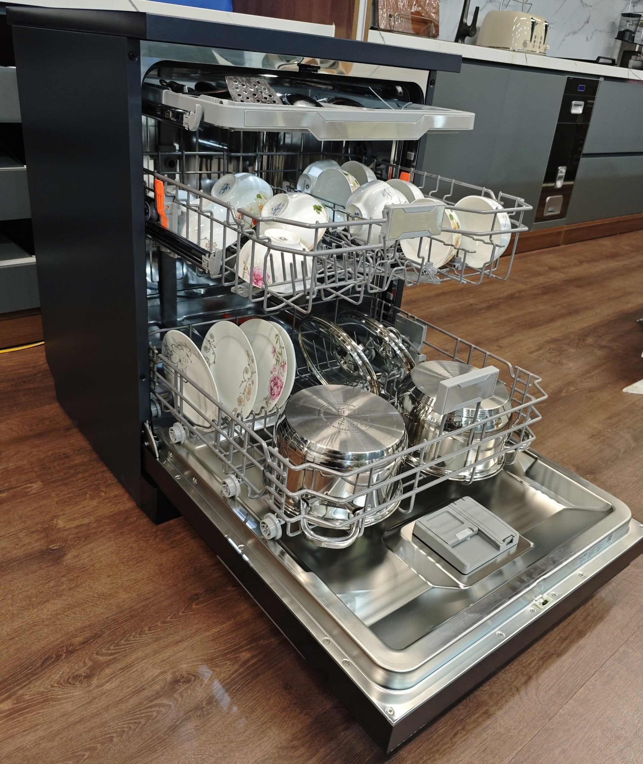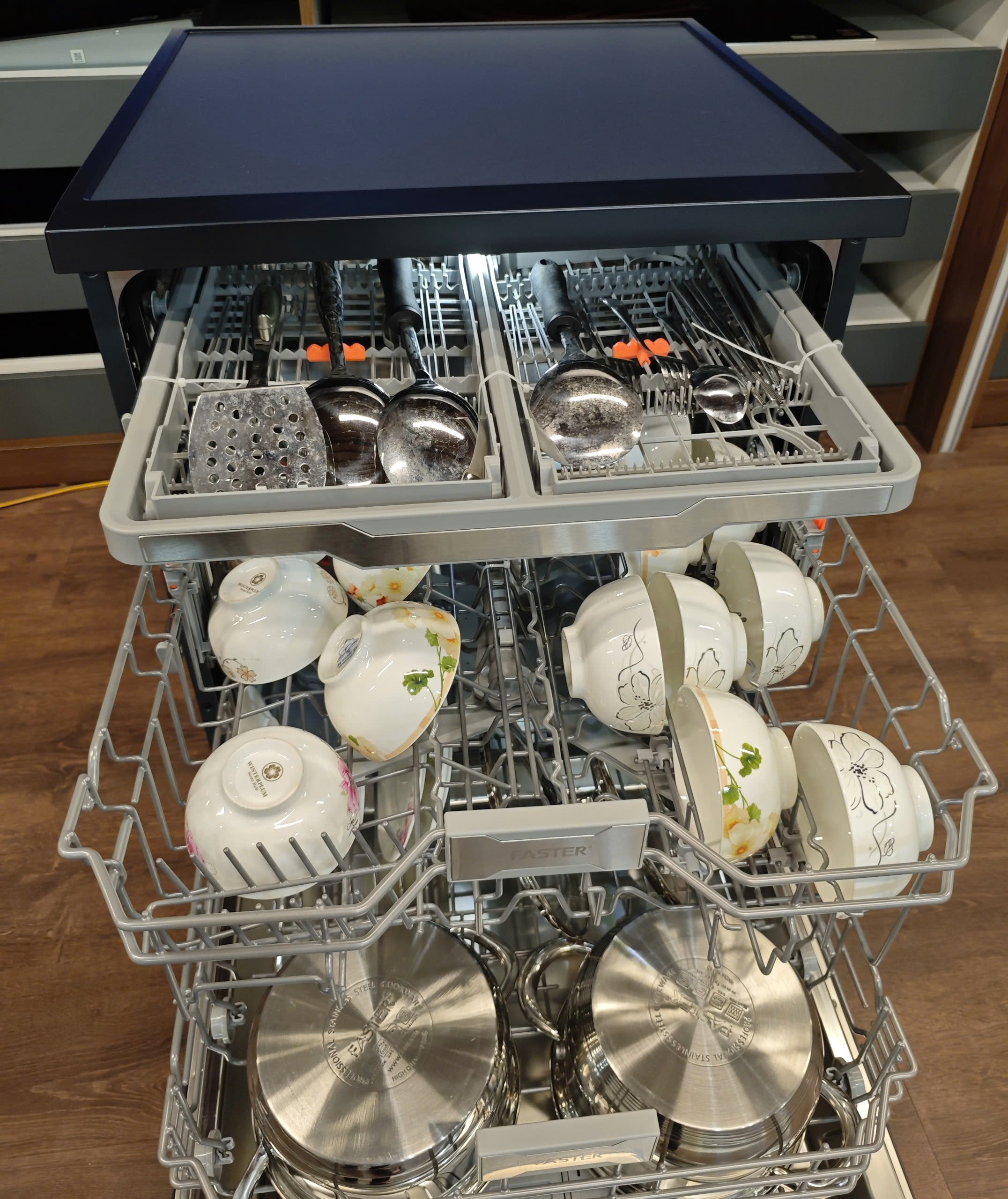 Máy rửa bát Faster ECO 8516 SERI 8 SMART trang bị 3 khay chứa cơ động.