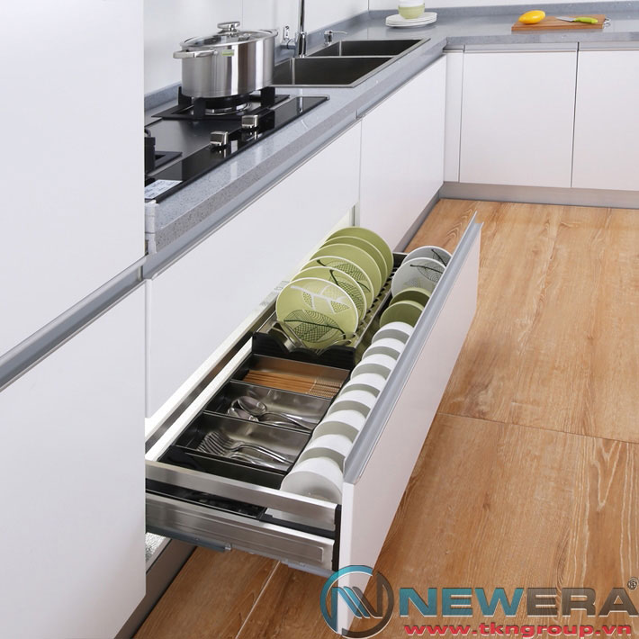 Ngăn kéo inox hộp Newera NE081190E để bát đĩa cánh kéo được trang bị ray trượt giảm chấn giúp giảm tiếng ồn khi đóng ngăn kéo và tăng tuổi thọ đồ gỗ của căn bếp.
