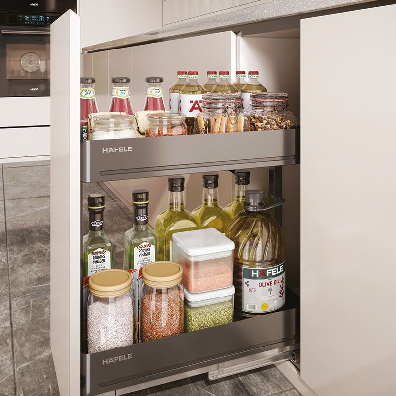 Thay vì xếp đồ đạc một cách không khoa học tạo nên sự bề bộn cho bếp thì rổ gia vị 2 tầng thép màu than chì 400mm Utensio Plus H2 Hafele 545.14.324 sẽ đem tới cho bạn sức chứa vô cùng lớn giúp căn bếp luôn sạch sẽ, gọn gàng. Với thiết kế đa tầng thông minh giúp lưu trữ đủ các loại gia vị, chai lọ từ chai thủy tinh lớn đến các hộp nhỏ một cách ngăn nắp, khoa học.