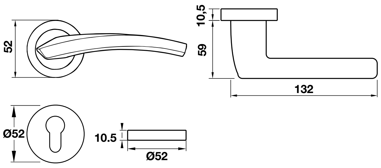 Trọn bộ gồm: 2 tay nắm gạt, 1 bộ nắp chụp tay nắm, 1 bộ nắp chụp ruột khóa PC, 1 bộ vít.
