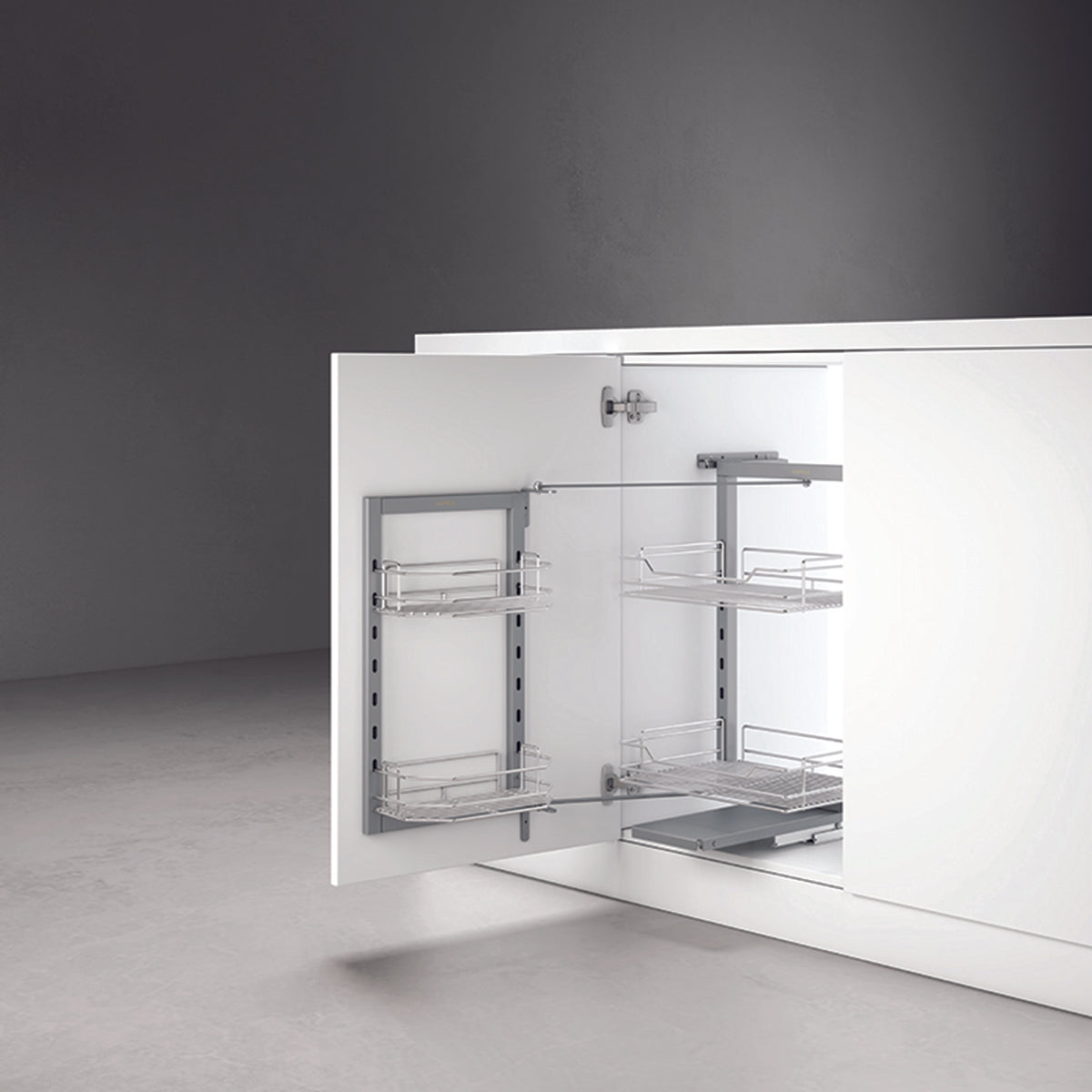 Thiết kế liên kết mở cửa giúp toàn bộ khay chứa được kéo ra ngoài chỉ bằng một lần mở cánh tủ, người dùng dễ dàng quan sát và lấy đồ bên trong. Lắp đặt linh hoạt, các khay chứa có thể điều chỉnh vị trí lắp cho phù hợp với chiều cao của các vật dụng nhà bếp bất kỳ nào mà không làm lãng phí không gian tủ.