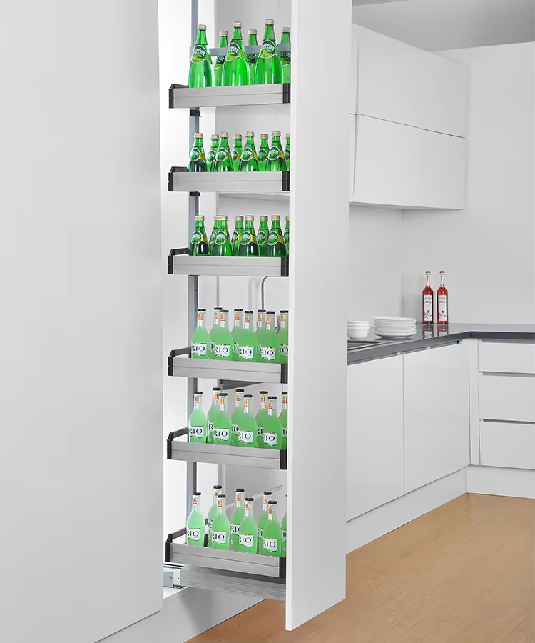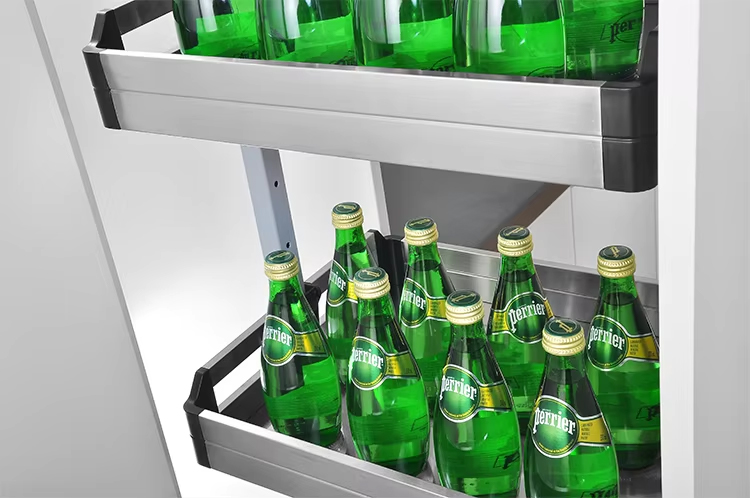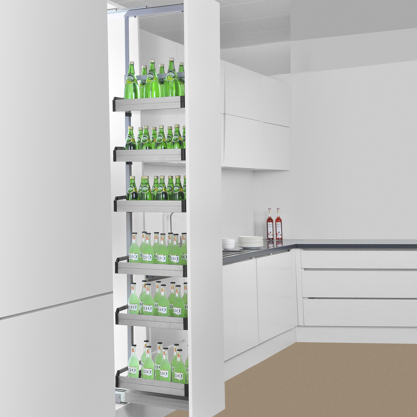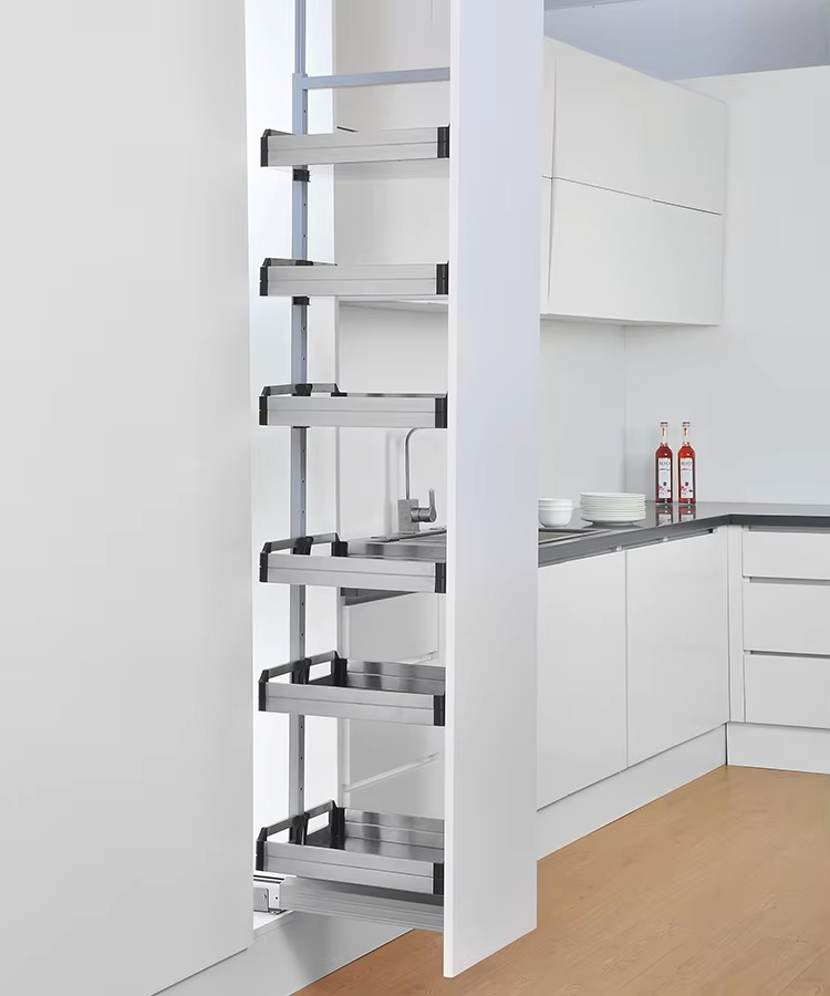 Thiết kế liên kết kéo cửa giúp toàn bộ khay chứa được kéo ra ngoài chỉ bằng một lần rút cánh tủ, người dùng dễ dàng quan sát và lấy đồ bên trong. Lắp đặt linh hoạt, các khay chứa có thể điều chỉnh vị trí lắp cho phù hợp với chiều cao của các vật dụng nhà bếp bất kỳ nào mà không làm lãng phí không gian tủ.