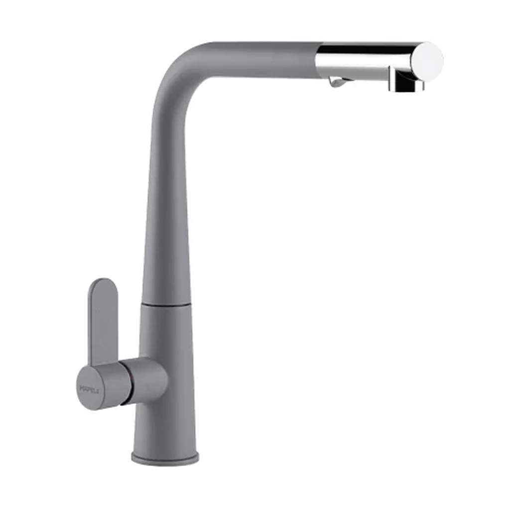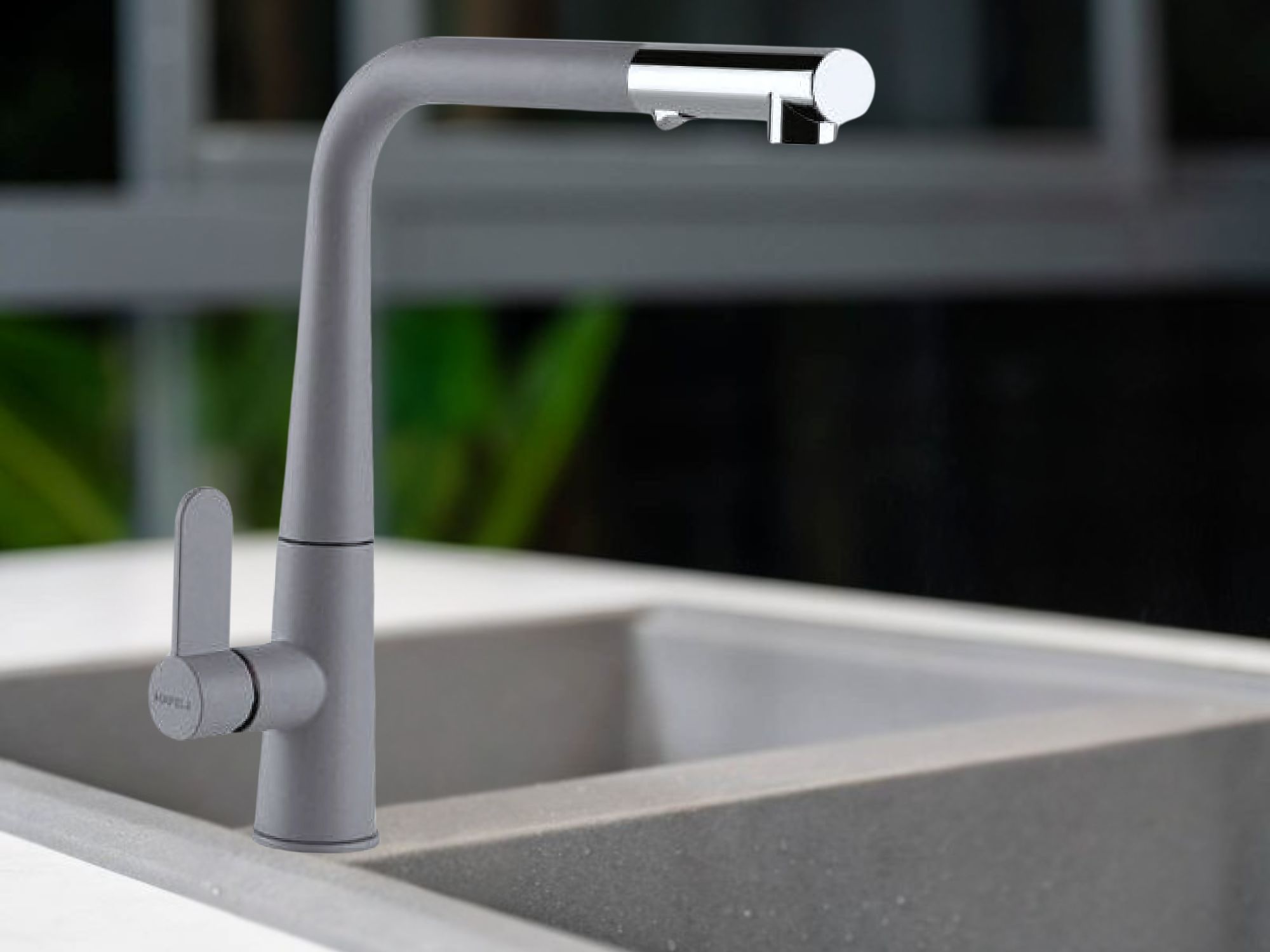 Vòi rửa bát Hafele HT20-GH1P259 | 570.82.400, có xuất xứ từ Châu Âu, không chỉ đóng vai trò là thiết bị hỗ trợ nhà bếp mà còn là điểm nhấn trang trí tinh tế cho không gian sống. Sự kết hợp hài hòa giữa các đường nét mềm mại và góc cạnh, cùng tông màu xám sang trọng nổi bật trên nền mạ chrome bóng loáng, tạo nên vẻ ngoài hiện đại và đầy cuốn hút, mang đến phong cách độc đáo cho căn bếp.