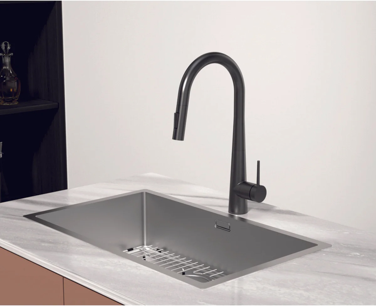 Sau khi sử dụng, đầu vòi sẽ tự động thu gọn về vị trí ban đầu, giữ cho không gian bếp luôn gọn gàng và thẩm mỹ. Đây là lựa chọn lý tưởng cho những ai đề cao sự linh hoạt, hiện đại và tiện nghi trong từng thao tác làm bếp hằng ngày.