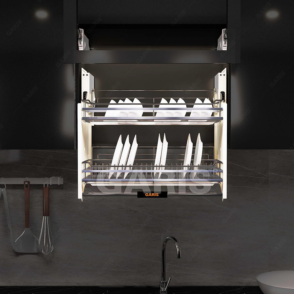 Giá bát đĩa nâng hạ Inox 304 nan dẹt xước mờ 600mm Garis GL06.60E