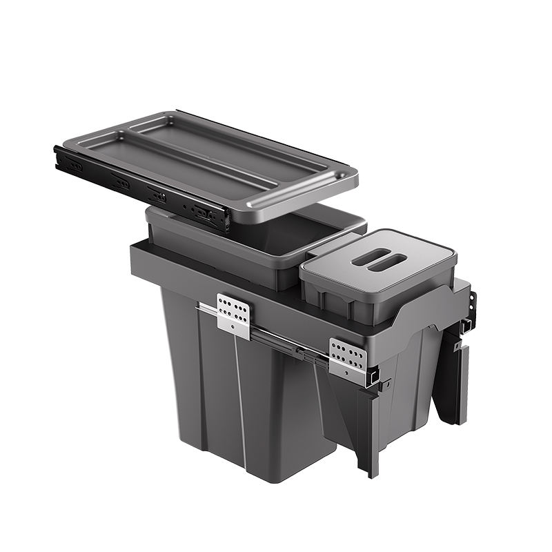 Thùng rác âm tủ 2 ngăn cánh kéo/mở màu xám 300mm GrandX XW.D30M