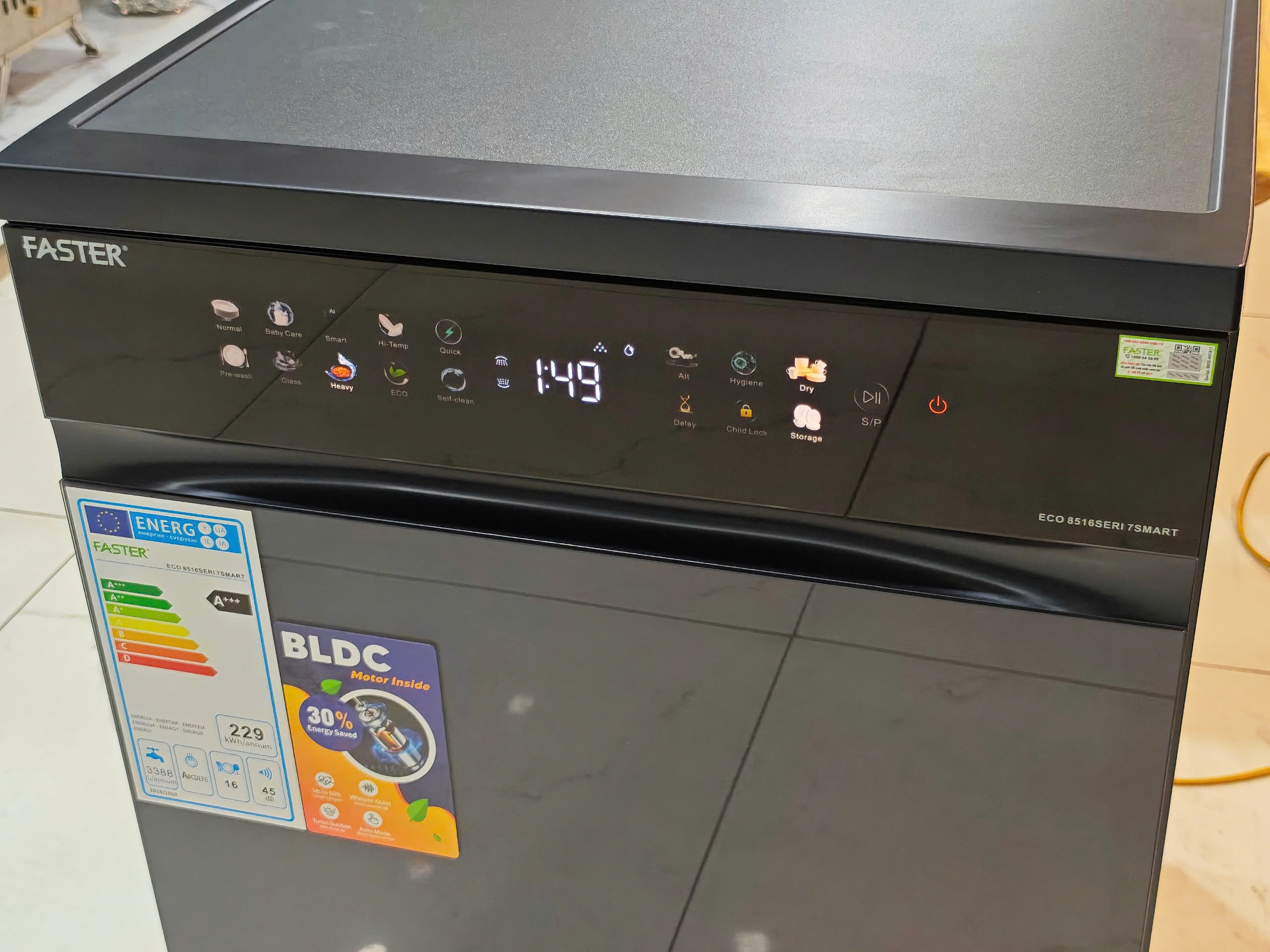 Máy rửa bát thông minh AI 16-18 bộ cửa kính xám Faster ECO 8516 SERI 7 SMART