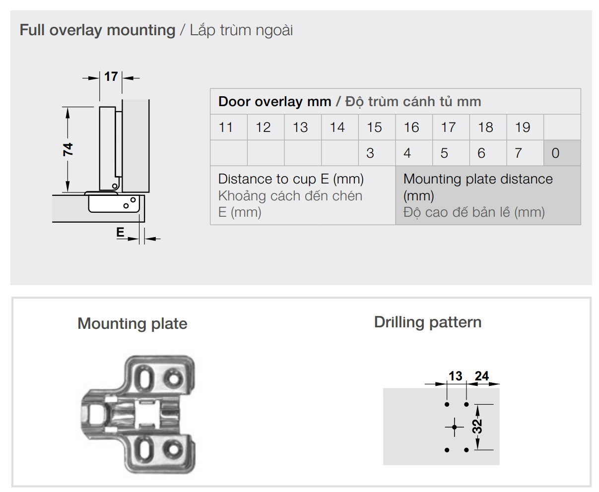 Bản lề không giảm chấn INOX SUS304 lắp trùm nửa Metalla SM 110º kèm đế Hafele 315.06.351 + 315.98.570