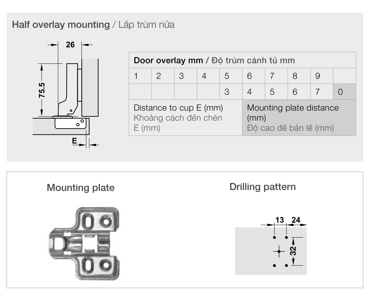 Bản lề không giảm chấn INOX SUS304 lắp trùm nửa Metalla SM 110º kèm đế Hafele 315.06.351 + 315.98.570