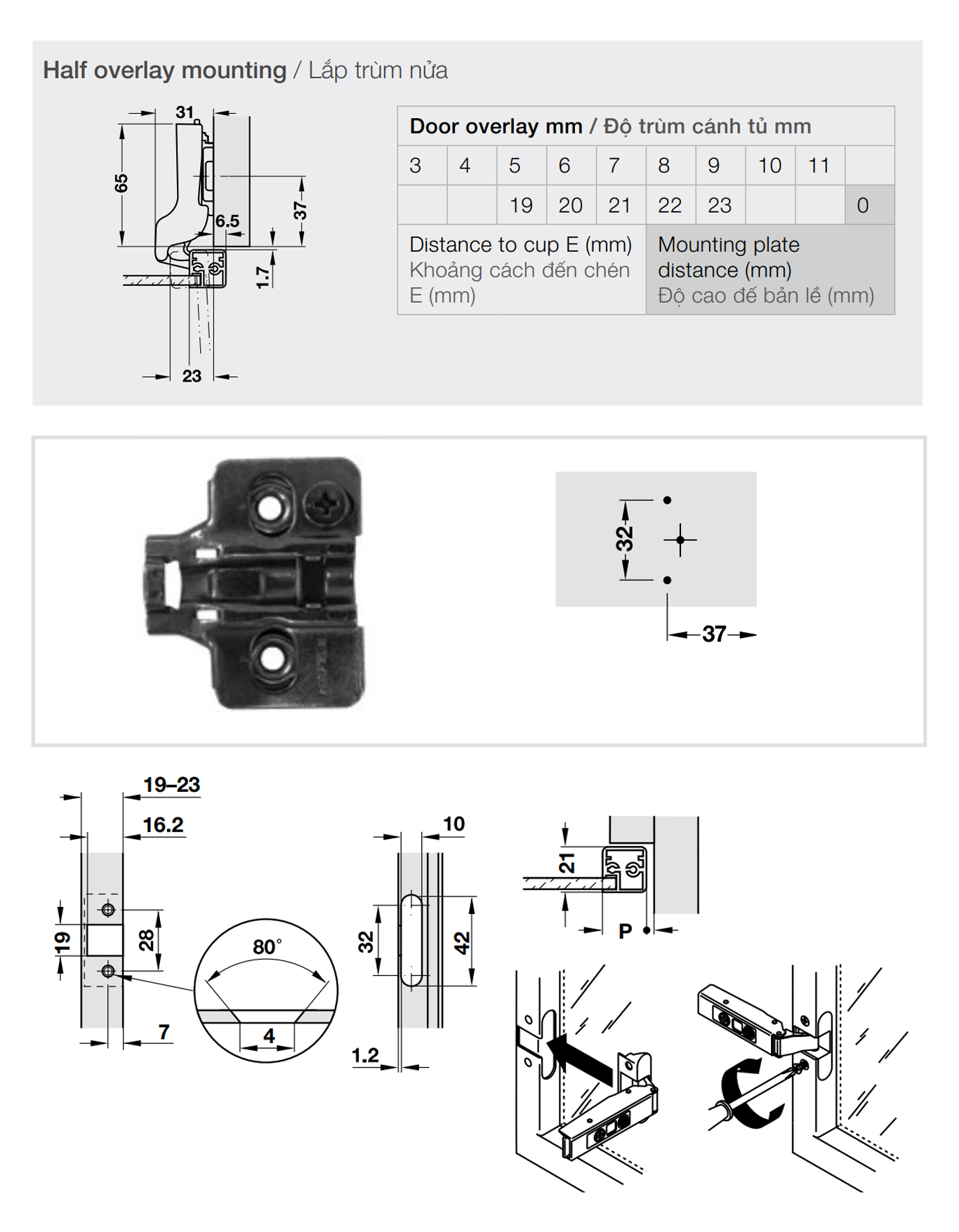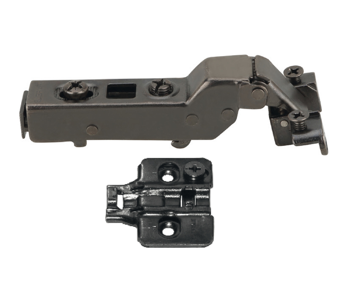Bản lề cho cửa khung nhôm giảm chấn thép mạ kẽm màu đen lắp lọt lòng Metalla SM 110º kèm đế Hafele 315.26.712 + 315.98.656