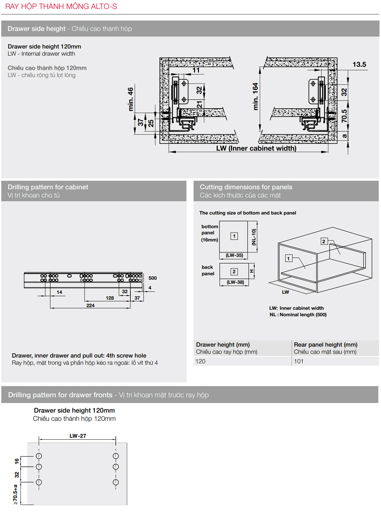 Ray hộp thành mỏng ALTO-S màu trắng mờ chiều cao 120mm Hafele 552.35.775