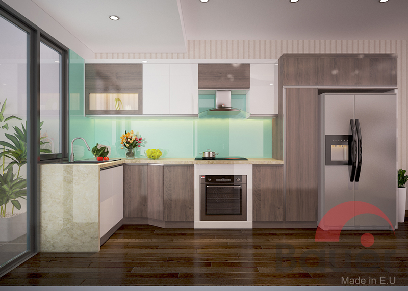 Khu bếp hiện đại bố trí các thiết bị bao gồm: Tủ lạnh, lò nướng, bếp điện từ, máy hút mùi, chậu, vòi rửa. Phía trên bố trí giá úp bát và các cánh tủ sơn MDF bệt tông màu trắng sáng tạo sự mới mẻ, tinh khôi cho khu bếp. Các kiến trúc sư đã khéo kéo thiết kế góc vát để tăng diện tích sử dụng cho chậu rửa.