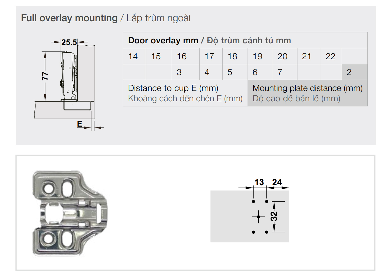 Đã bao gồm: Đế bản lề với 4 lỗ bắt vít