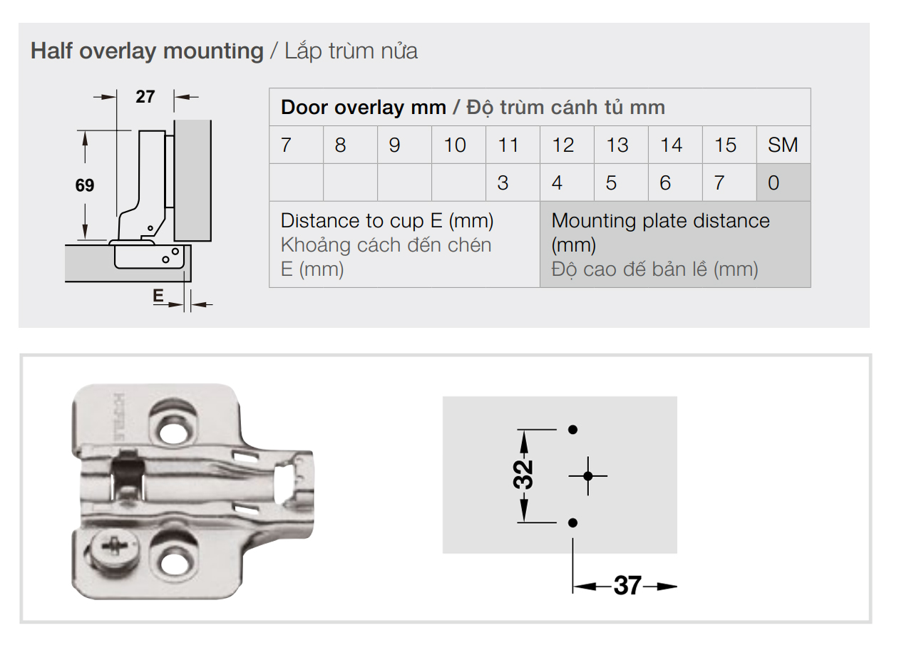 Điều chỉnh: mặt bên ±2 mm, chiều cao +2 mm (qua đế bản lề), chiều sâu ±2 mm