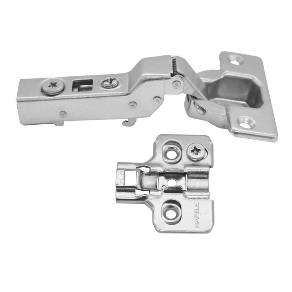 Bản lề giảm chấn thép mạ Niken màu sáng lắp trùm nửa Metalla SM 95º cho cửa gỗ dày kèm đế Hafele 315.08.851 + 315.98.670