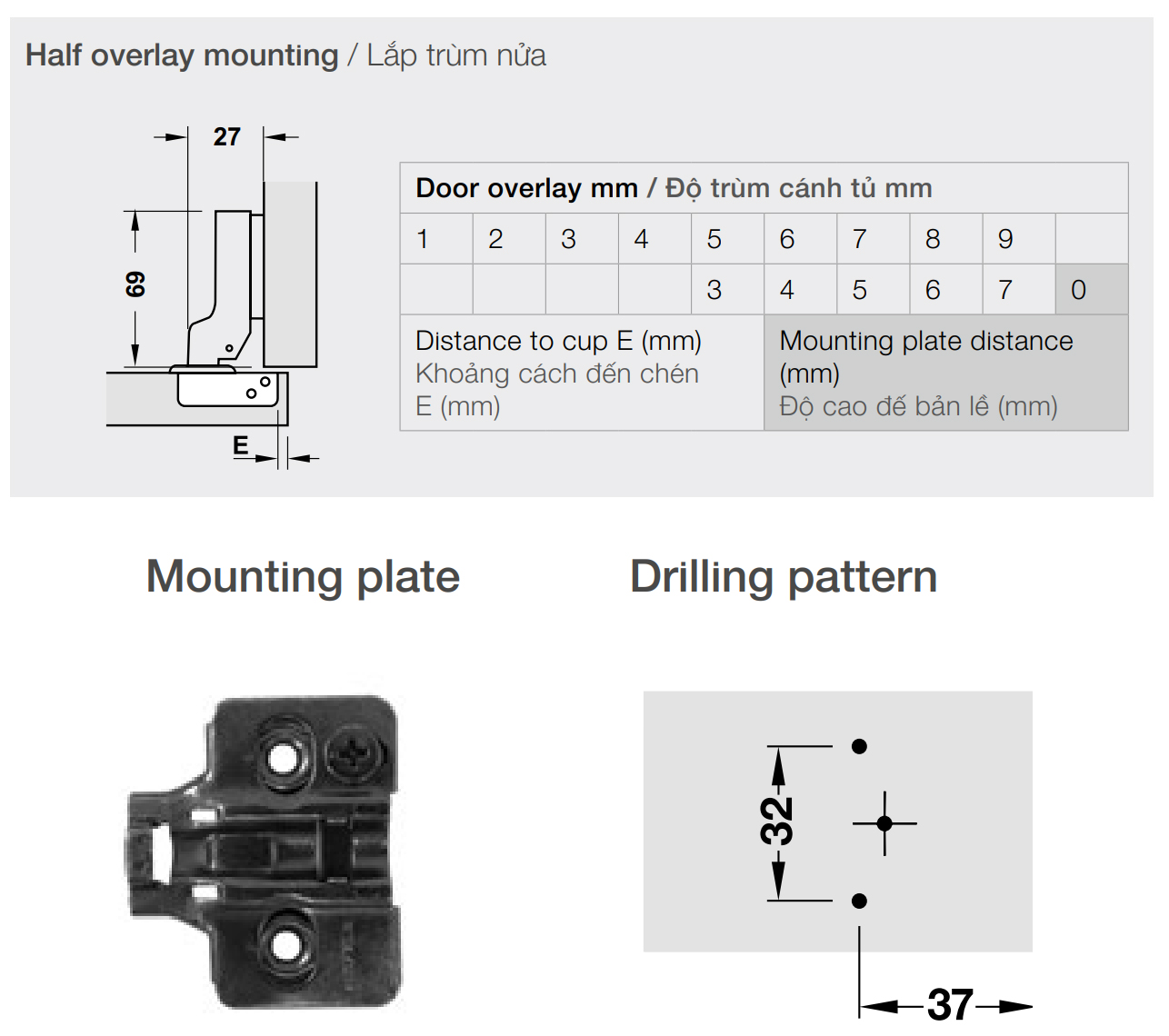 Điều chỉnh: Điều chỉnh mặt bên ±3 mm, điều chỉnh chiều cao +2 mm (qua đế bản lề), điều chỉnh chiều sâu ±2 mm