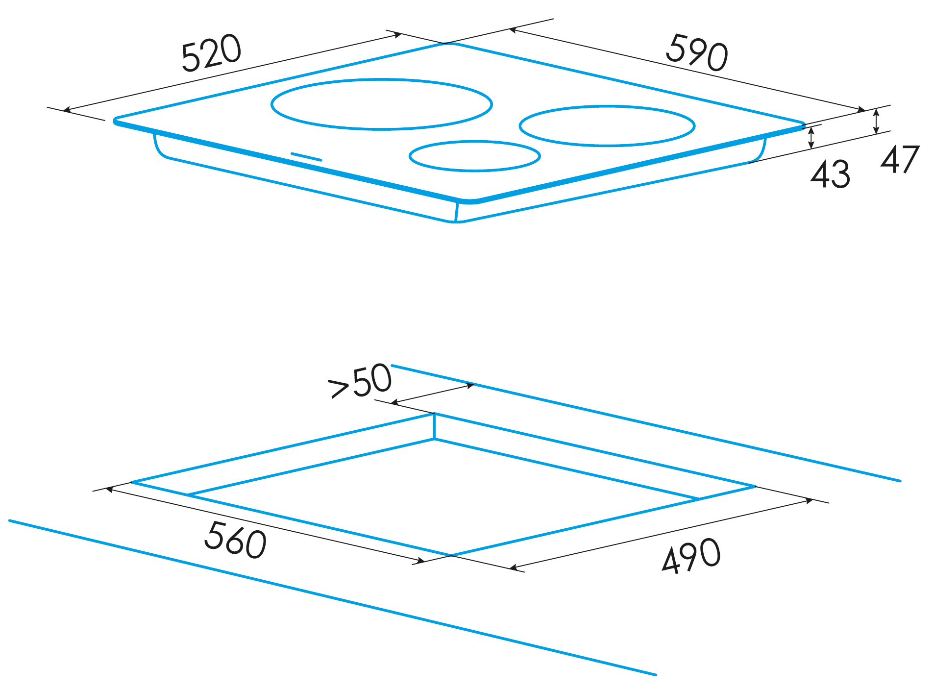 - Kích thước khoét đá: R560 x S490 (mm)
