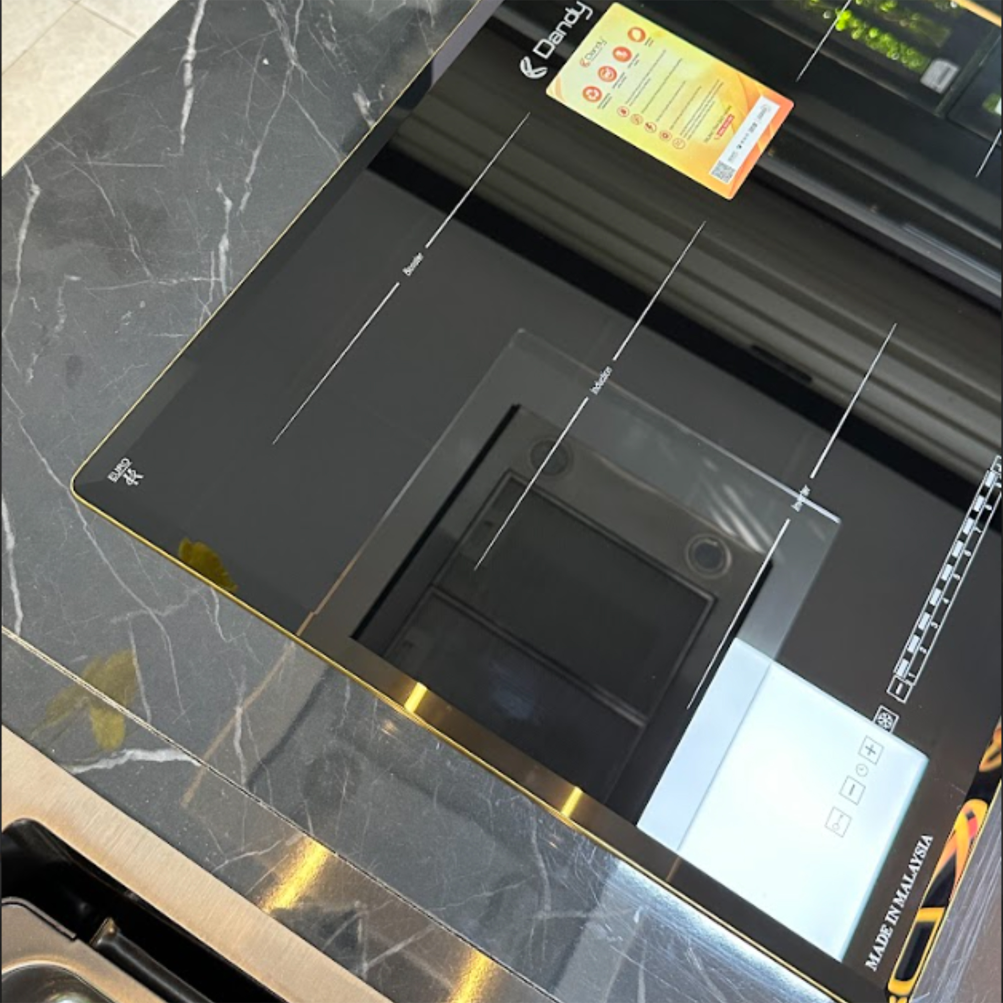 - Mặt kính Ceramic Eurok Glass vát 4 cạnh, bo viền nhôm Aluminium màu vàng sang trọng