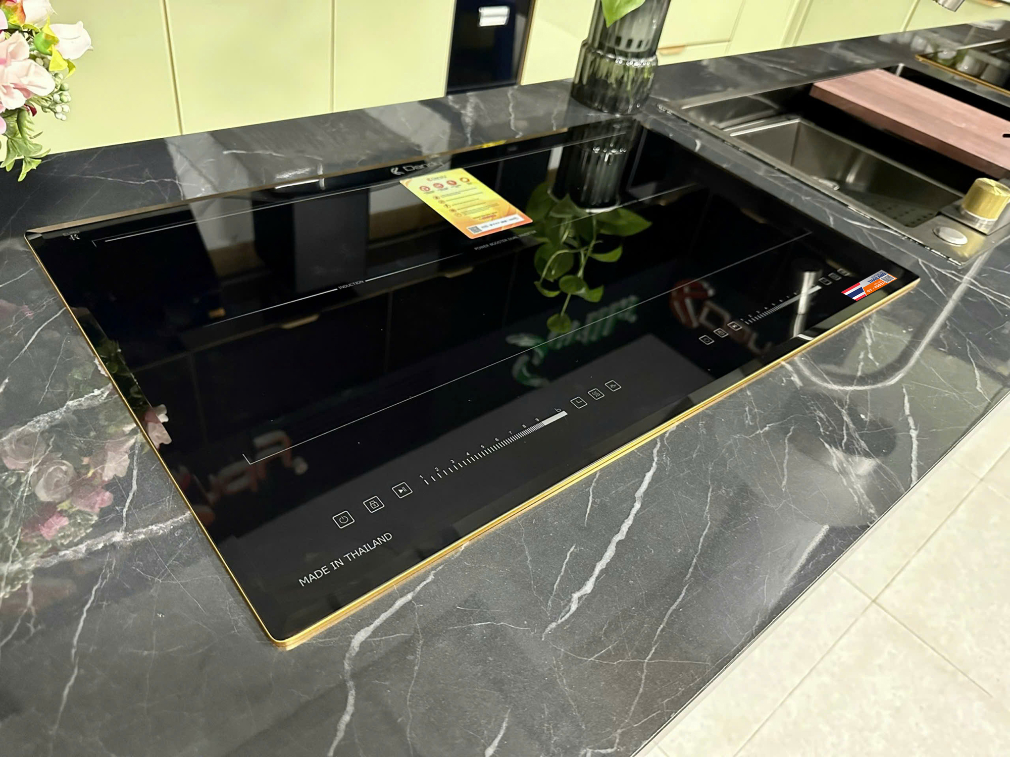 - Mặt kính Ceramic Eurok Glass, bo viền nhôm Aluminium màu vàng sang trọng