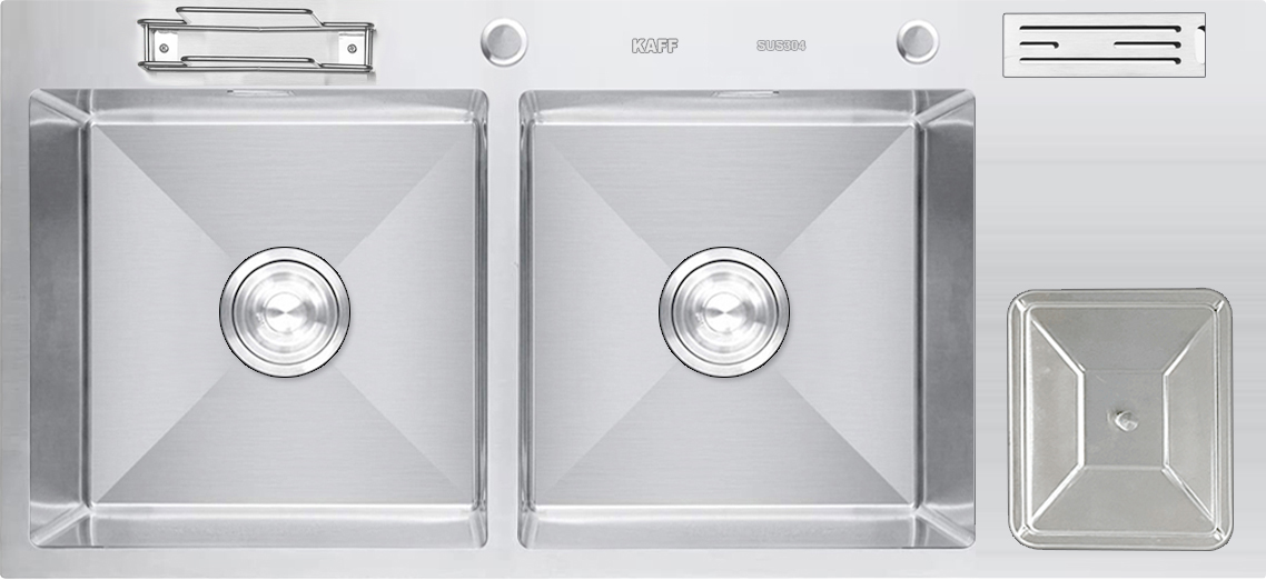 Chậu rửa Kaff KF-D-HM10048 | 2 hố cân - 1 bàn chờ bên phải | có hố rác và giá cài dao, để thớt | INOX SUS304 | thiết kế sang trọng | an toàn và bền bỉ trong quá trình sử dụng