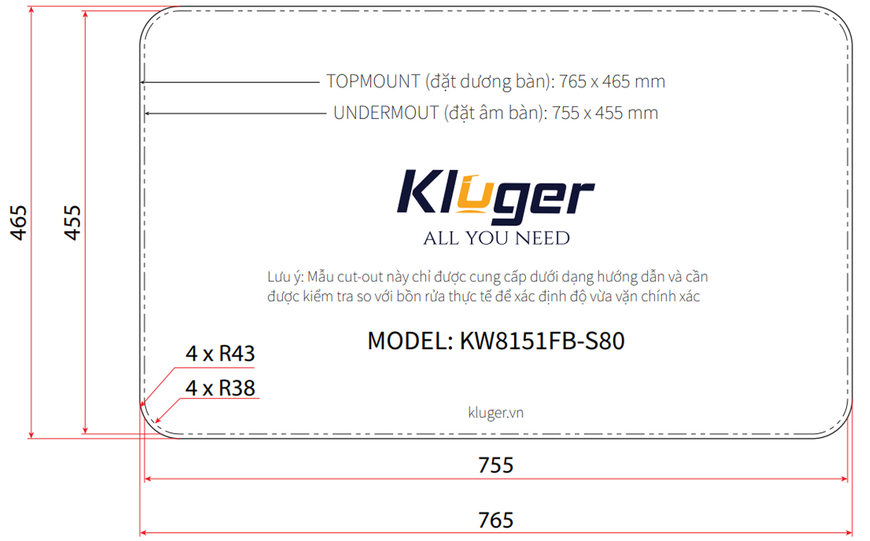 - Top Mount - Dương bàn: W765 x D465 (mm) - Góc lượn 4 x R43.