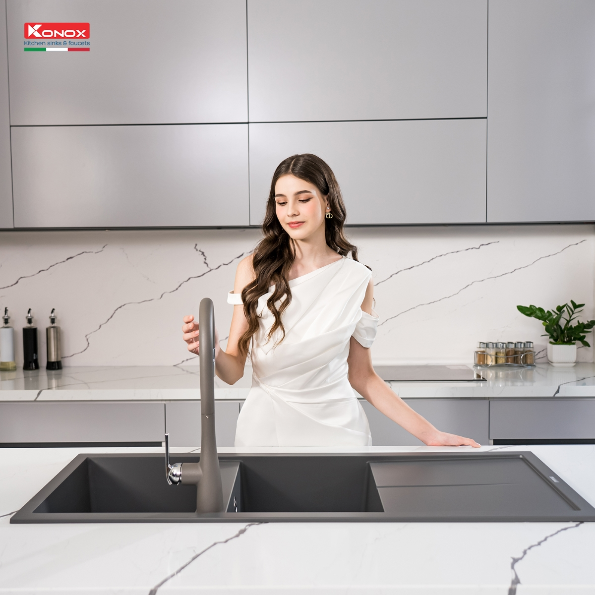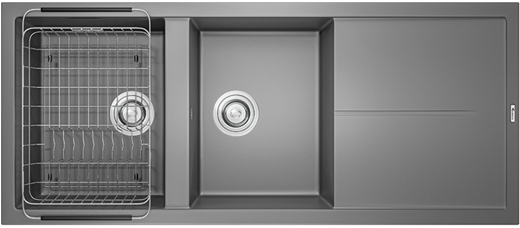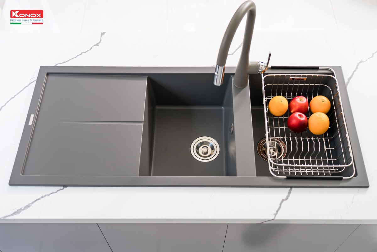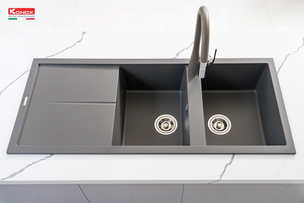 Chậu rửa đá cao cấp | Granite Sink | Konox Livello Smart 1160 Grey | hai hố cân | bàn chờ xoay trái hoặc phải | thiết kế sang trọng | an toàn và bền bỉ trong quá trình sử dụng.