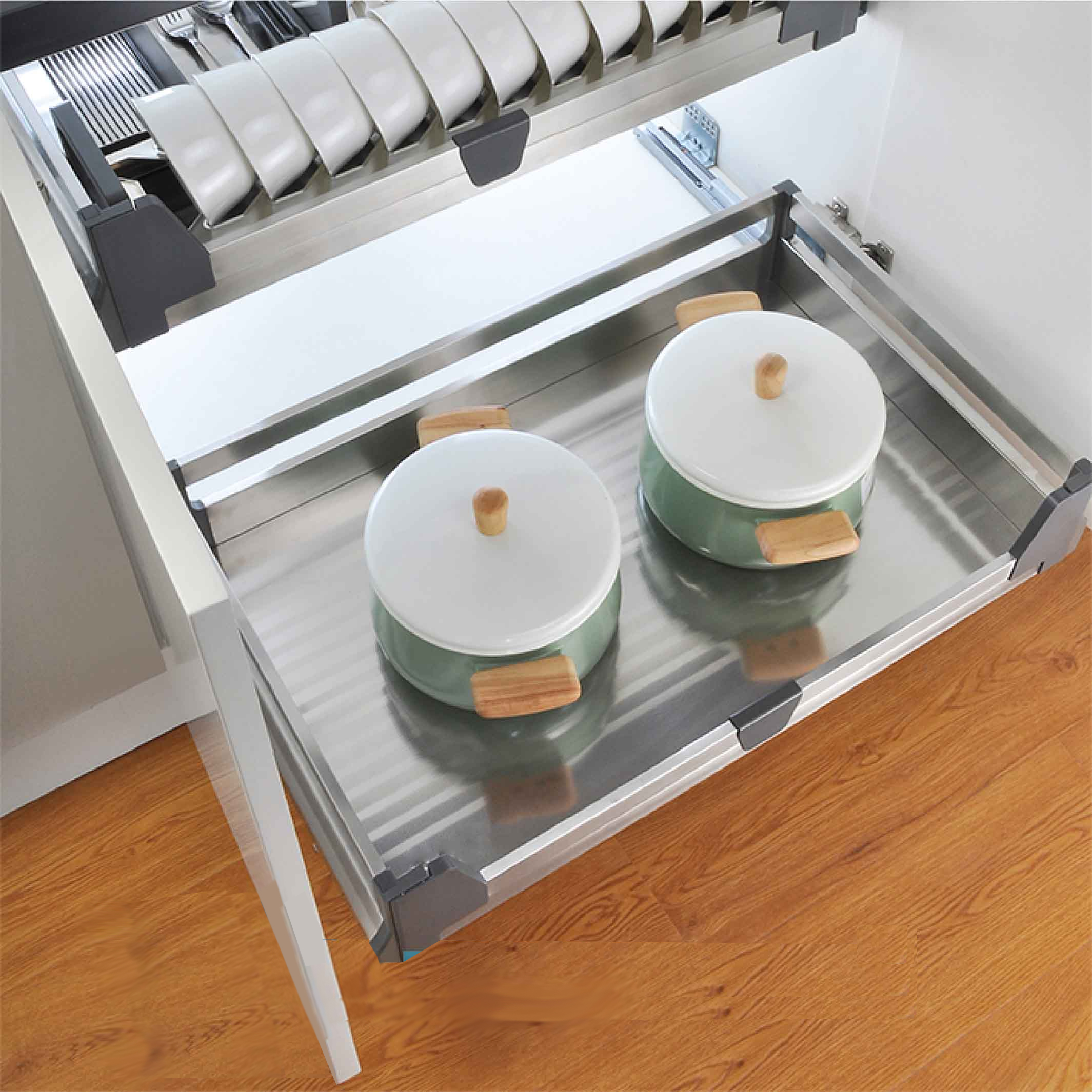Thiết kế ray trượt sẽ giúp bạn tiết kiệm rất nhiều sức lực khi lấy và cất đồ. Chỉ cần kéo nhẹ, ngăn tủ tự động đẩy ra và việc lấy đồ dễ dàng hơn. Cơ cấu giảm chấn giúp ngăn kéo tự khít vào khi đẩy nhẹ, giảm chấn động. Điều này sẽ tránh được hiện tượng xoong nồi bị xô đẩy, va chạm vào nhau.