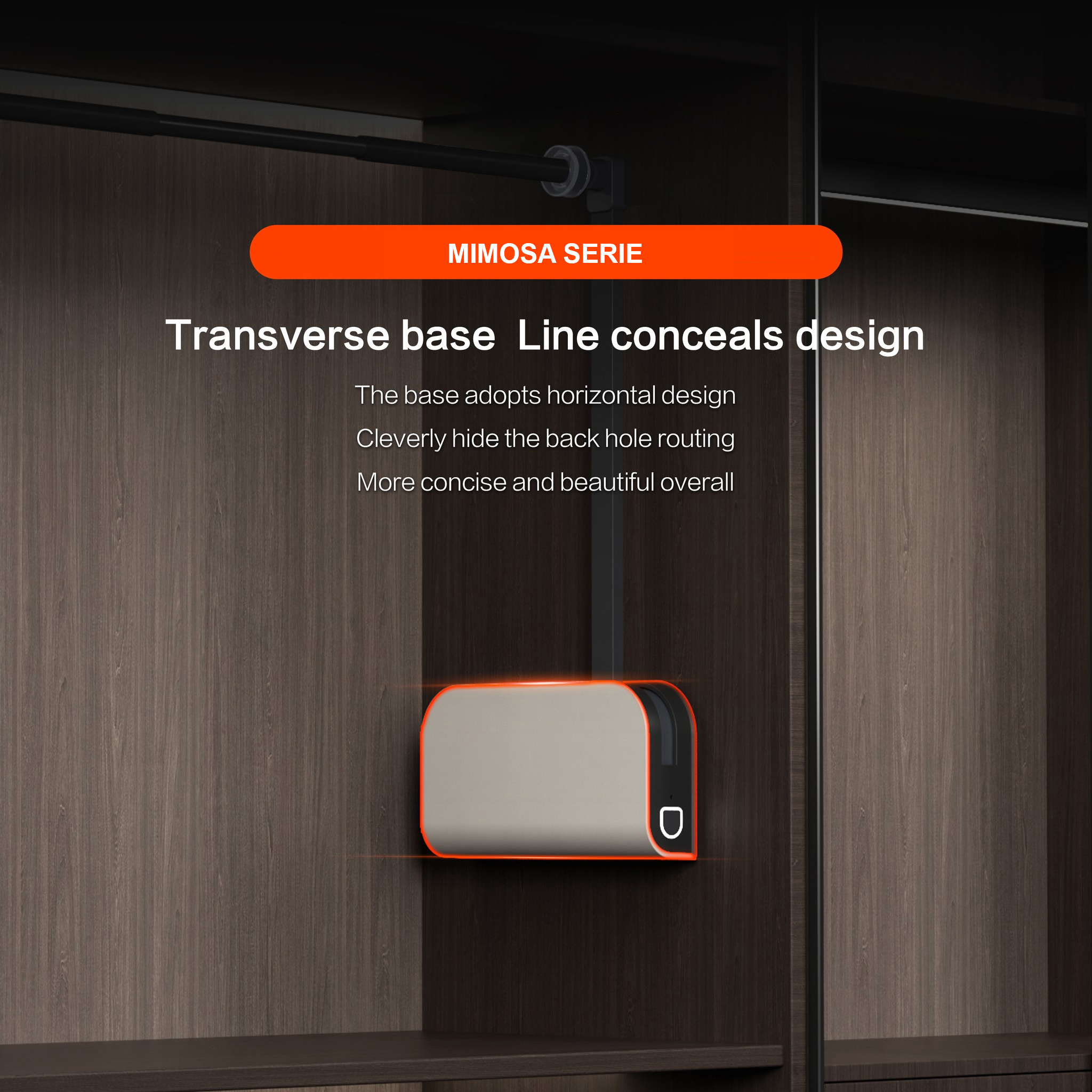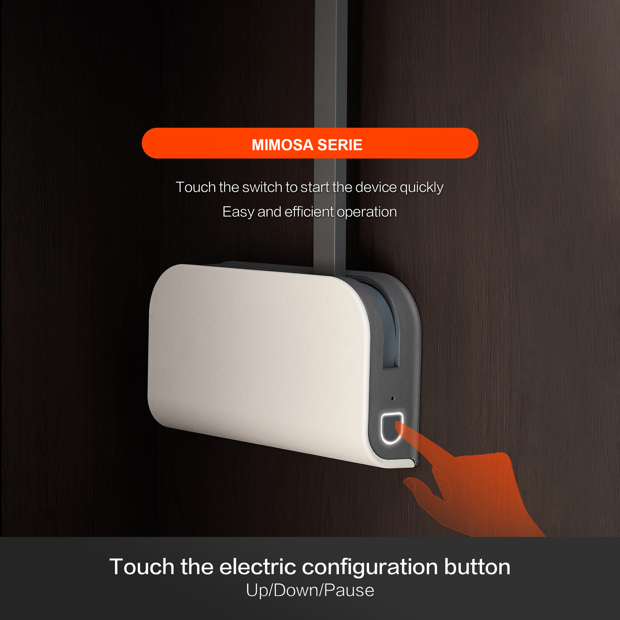 Giá nâng hạ điện cảm ứng treo quần áo GrandX XM.15E-Luxury có thể lắp đặt phù hợp với tủ quần áo cửa mở hoặc tủ quần áo cửa trượt. Điều khiển bằng phím cảm ứng ở bên cạnh hộp cơ cấu chuyển động.